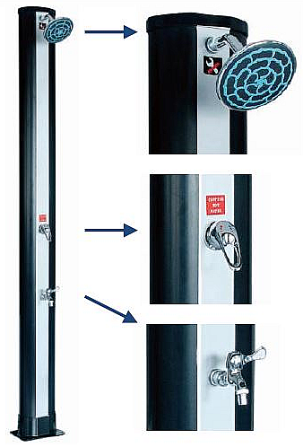 Druhá z radu našich solárnych spŕch. Blue Rainbow 2 je opäť 214 cm vysoká, rozdielom oproti lacnému modelu Blue Rainbow 1 je že má navyše aj kohútik na nohy , čo je veľmi praktická vec. Pohodlne si opláchnete nohy, napríklad pred vstupom do bazéna alebo do vírivej vane. Ohrev vody v tomto modeli je taktiež garantovaný čiernym povrchom solárnej sprchy. Je vybavená aj dizajnovým strieborným pruhom uprostred, ktorý ocenia náročnejší zákazníci. Vnútri solárnych spŕch je horúca ohriata voda slnečnými lúčmi, ktorá sa v mixovacej nádrži zmiešava so studenou vodu z vodovodného radu cez záhradnú hadicu. Teplotu vody si regulujete ako vo vani – pomocou pákovej batérie.