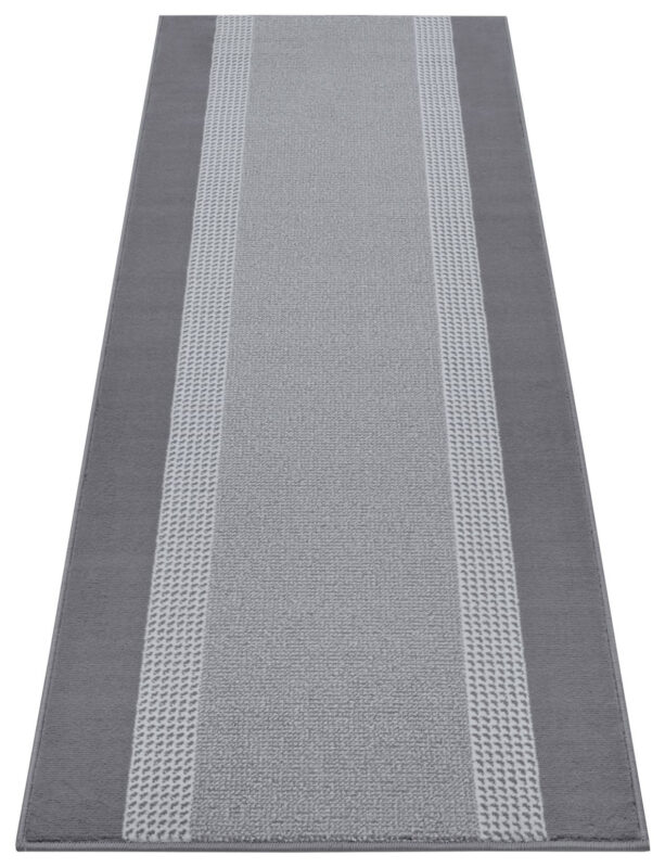 Behúň so svetlo šedým stredom a tmavo šedými pruhmi po obvode dlhších strán. Jedná sa o kvalitný kúsok zo 100% polypropylénu s jutou na rubovej strane. Vďaka stredne vysokému strihanému vlasu je veľmi komfortný na došľap. Ďalej je obšitý po celom obvode a ľahko udržateľný.