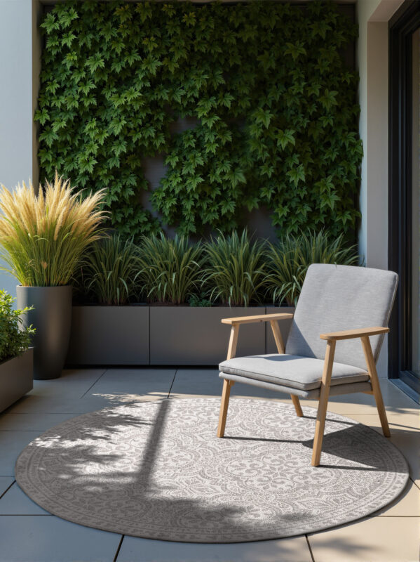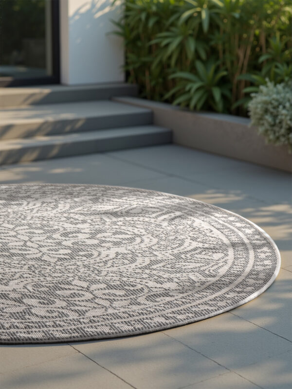 Okrúhly koberec Duet v elegantnom čiernobielom dizajne sa stane originálnym prvkom každého moderného interiéru, ale skvele vynikne aj na terase či balkóne. Vkusná kombinácia štýlu a praktickosti na každodenné použitie.