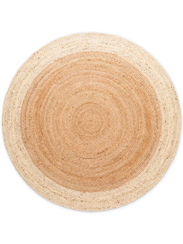 Okrúhly koberec Jutta z ručne tkanej prírodnej juty v teplej kombinácii slonovinovej a zlatej je jedinečný prírodný doplnok do interiéru aj na krytú terasu. Každý kus je originál vďaka ručnému spracovaniu a prírodne farbeným vláknam. Odolný, antistatický, certifikovaný OEKO-TEX a vhodný aj pre podlahové kúrenie.