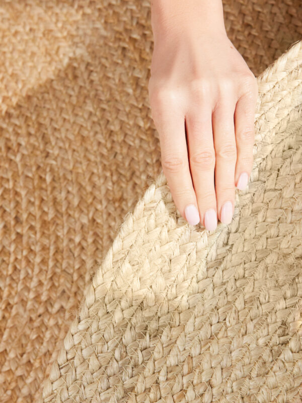 Okrúhly koberec Jutta z ručne tkanej prírodnej juty v teplej kombinácii slonovinovej a zlatej je jedinečný prírodný doplnok do interiéru aj na krytú terasu. Každý kus je originál vďaka ručnému spracovaniu a prírodne farbeným vláknam. Odolný, antistatický, certifikovaný OEKO-TEX a vhodný aj pre podlahové kúrenie.