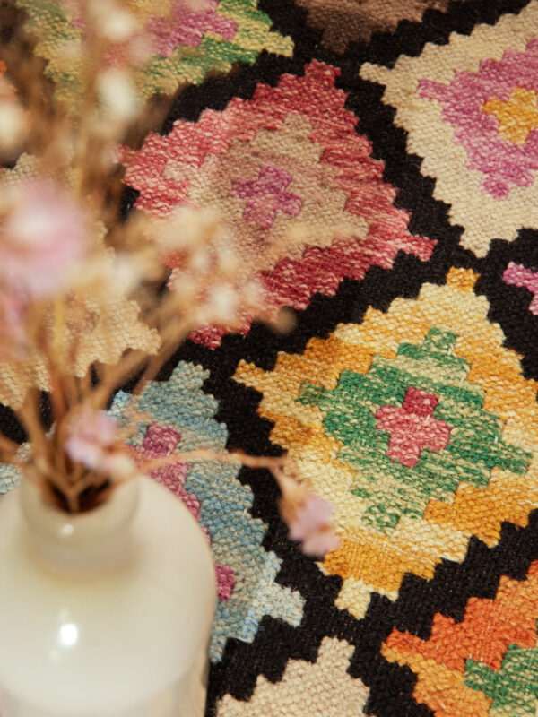 Ručne tkaný koberec Kamal Zara v pestrých farbách spája tradičný afganský štýl s udržateľným prístupom. Kombinácia vlny a bavlny zaručuje odolnosť, mäkkosť a jednoduchú údržbu. Nízky vlas, jemné strapce a výrazný vzor z neho robia osobitý doplnok do obývačky, spálne i jedálne.