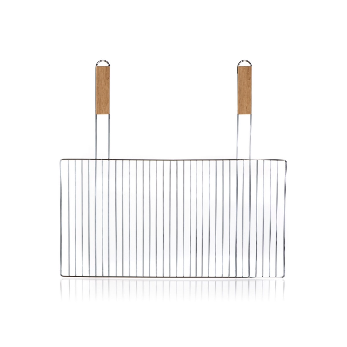 Hranatý grilovací rošt BBQ s drevenými rukoväťami s rozmerom 57 x 30 cm využijete na jednoduché grilovanie mäsa, zeleniny a iného. Je vhodný aj pre murované záhradné grily. Rošt je vyrobený z pochrómovanej ocele, počet drôtov na rošte je 34 kusov.Priemer: vonkajšieho drôtu 0,4 cm, vnútorného drôtu 0,3 cm, drôtu na rukoväti 0,45 cm.