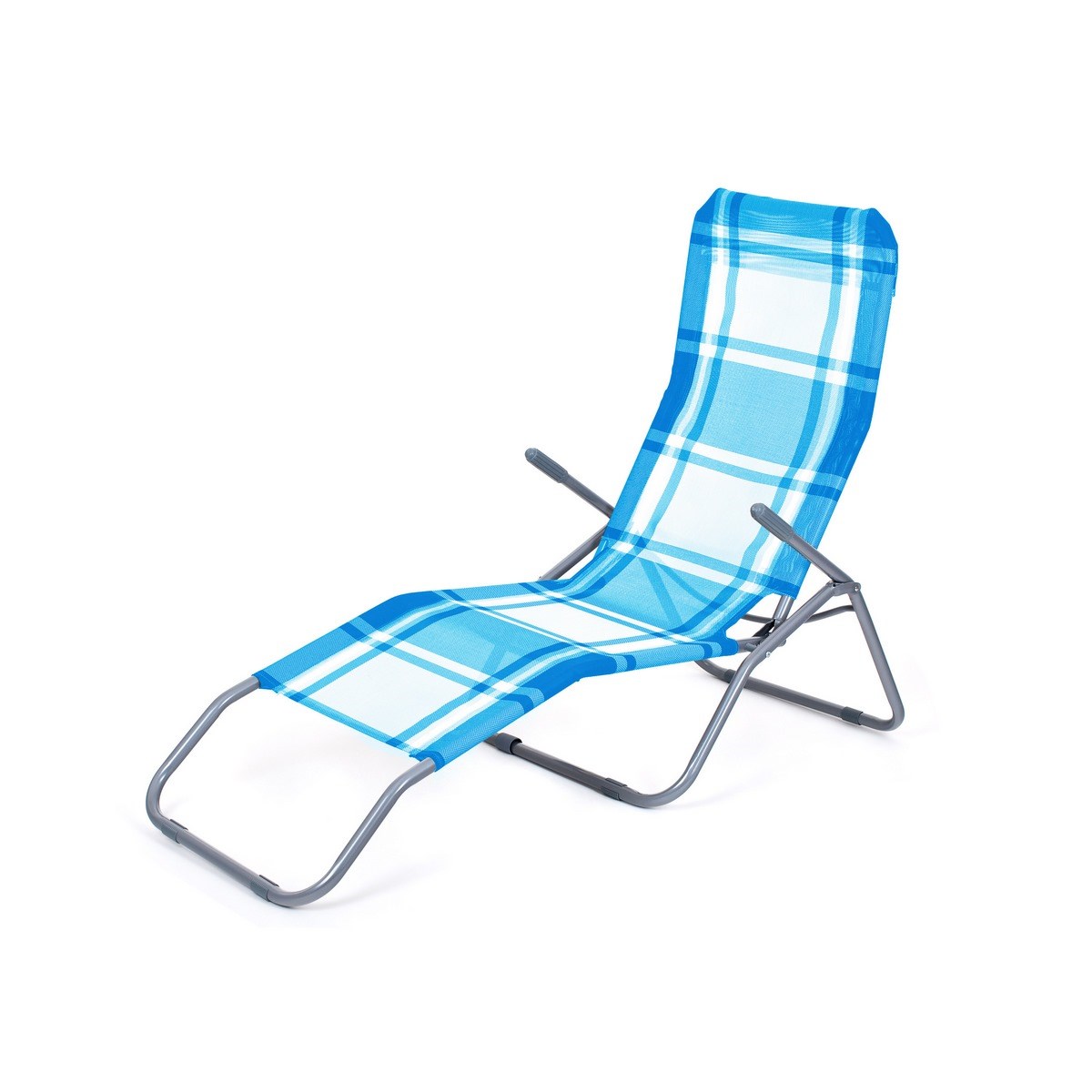 Plážové ležadlo je vhodné na relaxáciu v záhrade, na chate alebo pri bazéne. Ležadlo má kovovú konštrukciu s plastovými doplnkami a je dodávané s textilným poťahom. Ležadlo je možné nastaviť do dvoch polôh (sed / ľah). Z polohy v sede stačí preniesť váhu tela do záklonu a ležadlo sa položí do vodorovnej polohy, pričom tvar ležadla zostáva rovnaký.Rozmery ležadla sú 142 x 60 x 96 cm. Nosnosť: 100 kg. Farba modrá s dekorom kocka.