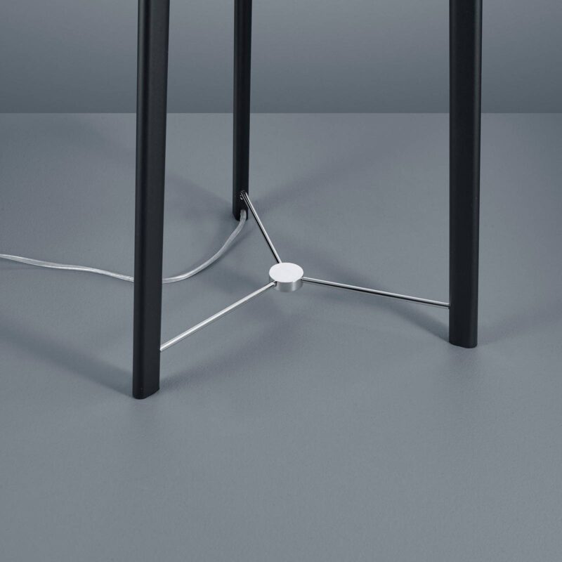 Textilná stojaca lampa Certo s kovovým rámom statívu Trendový kovový rám z troch nôh v matnej čiernej farbe a valcovitého tvaru tienidlo na lampu z chintzu – to sú komponenty modernej stojaca lampa Certo od spoločnosti Helestra. Predstavuje rovnako dekoratívny a nadčasový zdroj svetla pre mnoho obytných priestorov, ktorý vyžaruje svetlo iba vertikálne priamo a silne lomené do strán. Certo je a je vybavený užívateľsky príjemným nožným spínačom na kábli.