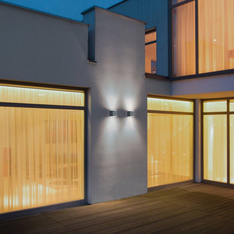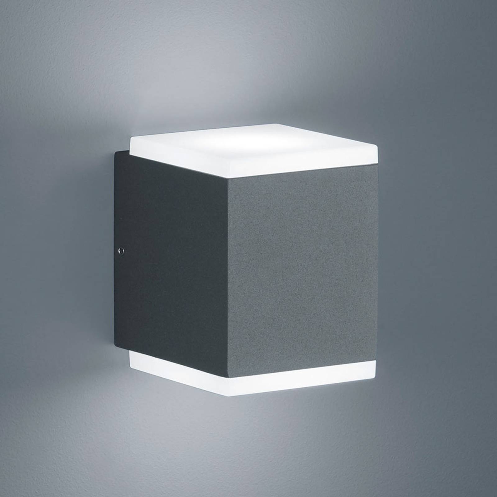 LED vonkajšie nástenné svietidlo Kibo v grafitovom prevedení s lúčom hore a dole Malé vonkajšie nástenné svetlo v tvare kocky LED Kibo je možné použiť ako vstupné osvetlenie vpravo a vľavo od predných dverí, ako zdroj svetla na terasu alebo na cesty okolo domu a zároveň na osvetlenie fasády. Grafitová prášková vrstva a hranatý dizajn z neho robia moderný a napriek tomu jednoduchý svetelný zdroj, ktorý dosahuje efektívny efekt iba pri zapnutí svetla. Potom svetlo svieti pozdĺž fasády nahor a nadol a vytvára jedinečné svetelné efekty, najmä keď je svietidlo zostavené v skupinách.