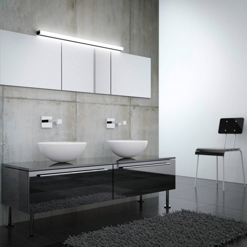 Úzke, hranaté LED nástenné svietidlo Lado s čiernym krytom na osvetlenie zrkadiel Či už na boku alebo nad zrkadlom, priamo na zrkadle, na stene alebo na strope – s nástenným svietidlom Lado LED je možné všetko. Príslušenstvo potrebné pre rôzne typy inštalácie je súčasťou dodávky. Difúzor lampy vyrobený z lešteného akrylu a kovová konzola v matnom čiernom prevedení tvoria tenkú hranatú lampu. Svetlo zabudovaných, teplých bielych LED diód vyžaruje rovnomerne z troch strán saténovaný akrylát, takže široká oblasť je priamo a nepriamo zásobovaná jasným a slabo oslňujúcim svetlom.