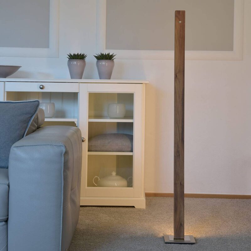 Hranatá stojacia LED lampa Leonora s funkciou stmievania Kvalitná stojacia LED lampa Leonora od značky HerzBlut sa vďaka svojmu nenápadnému dizajnu dá ľahko integrovať do existujúcich interiérov. Moderný svetelný zdroj pozostáva z dlhého tienidla z masívneho dreva, ktoré stojí na kovovom podstavci s matným povrchom z brúseného niklu. Energeticky úsporné LED diódy sú zoradené na jednej strane úzkeho stĺpika. Mimoriadne útulné osvetlenie sa dosiahne umiestnením svetelného prvku smerom k stene. Leonora sa dá ovládať priamo pomocou tlačidiel pripevnených na svietidle. Nožný spínač slúži na zapínanie a vypínanie a dotykovým stmievačom možno regulovať osvetlenie podľa potreby. Integrovaná technológia stmievania umožňuje plynulé nastavenie jasu a farby svetla (2 200 – 4 000 K). Čím nižšia je intenzita, tým teplejšie svetlo svieti do miestnosti. Vysoká hodnota CRI (>90) tiež zabezpečuje, aby sa farby zobrazovali čo najmenej skreslene. Príspevky spoločnosti HerzBlut k ochrane životného prostredia – CO² neutrálne dodávky energie pre firemné priestory a výrobu – Vyrobené v Nemecku – Regionálni dodávatelia – Certifikácia výrobkov z dreva podľa FSC – Ekologicky šetrné obaly – Reklamné materiály vyrobené výlučne z prírodných materiálov – Svietidlá sú vyrobené z prírodných a obnoviteľných surovín – LED diódy môže výrobca vymeniť – Časti svietidla sú 100 % recyklovateľné – Vlastná opravárenská dielňa