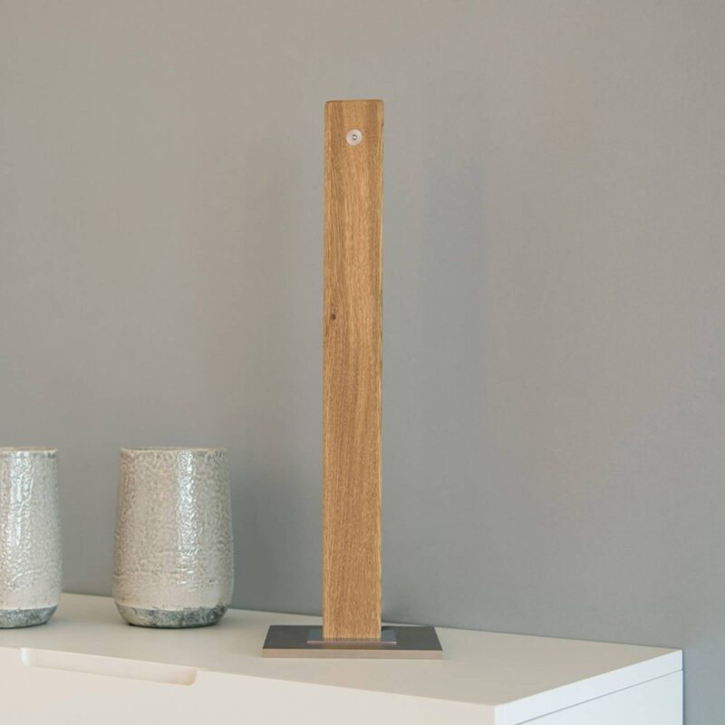 Stmievateľná stolová LED lampa Leonora z masívneho dreva v tvare stĺpa Stolová lampa Leonora v tvare stĺpika je krásnym bytovým doplnkom do moderných interiérov. Leonora nielenže vyzerá vysokokvalitne, ale v skutočnosti je prémiovým výrobkom nemeckého výrobcu HerzBlut. Svietidlá od spoločnosti HerzBlut sú vyrábané ručne s veľkou láskou k prírodnému materiálu drevo. Vďaka technológii stmievania do tepla možno energeticky úsporné LED diódy plynule nastaviť na požadovanú atmosféru. Pomocou dotykového stmievača priamo na svietidle možno meniť intenzitu svetla aj jeho farbu (2 200 – 4 000 K) – čím je svetlo slabšie, tým sa zdá byť teplejšie. Index podania farieb zabudovaných diód LED je veľmi dobrý (> 90), takže farby okolia sa reprodukujú takmer nezmenené. Príspevky spoločnosti HerzBlut k ochrane životného prostredia – CO² neutrálne zásobovanie podnikových prevádzok a výroby energiou – Vyrobené v Nemecku – Regionálni dodávatelia – Certifikácia výrobkov z dreva podľa FSC – Ekologický obal – Reklamné materiály vyrobené výlučne z prírodných materiálov – Svetlá sú vyrobené z prírodných a obnoviteľných surovín – LED diódy môže vymeniť výrobca – Časti svietidla sú 100 % recyklovateľné – Vlastná opravárenská dielňa