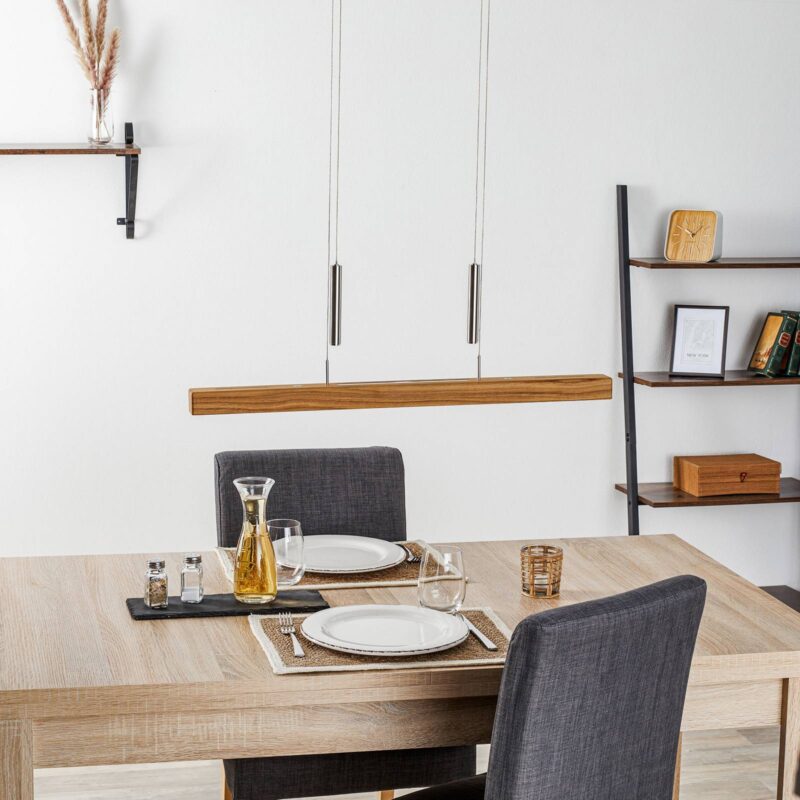 Stmievateľné LED barové svietidlo Leonora z masívneho dreva – prémiová kvalita z Nemecka Závesné svietidlo Leonora je ideálne na osvetlenie jedálenských stolov a jeho výšku (95-160 cm) možno nastaviť v niekoľkých jednoduchých krokoch pomocou integrovaného káblového mechanizmu. Lineárny tvar a teplý odtieň dreva svietidla sa okrem iného dokonale hodia k škandinávskym štýlom bývania. Leonora je vybavená LED diódami v hornej aj dolnej časti. Kombinácia priameho a nepriameho osvetlenia vytvára útulný svetelný obrazec, ktorý ešte viac umocňujú satinované kryty a nadpriemerné prirodzené podanie farieb (CRI > 90). Leonoru možno podľa potreby plynule stmievať bez potreby inštalácie ďalších zariadení. Integrovaná funkcia stmievania umožňuje aj automatické nastavenie farby svetla v rozsahu od 2 200 do 4 000 kelvinov počas procesu stmievania. Funkciu Klick&Dim môžete použiť buď prostredníctvom existujúceho nástenného vypínača, alebo tlačidla priamo na svietidle. Svietidlá značky HerzBlut sú symbolom ručne vyrábaných kvalitných produktov Made in Germany. Príspevky značky HerzBlut k ochrane životného prostredia – Neutrálne dodávky energie CO² pre firemné priestory a výrobu – Vyrobené v Nemecku – Regionálni dodávatelia – Certifikácia výrobkov z dreva podľa FSC – Ekologicky šetrné obaly – Reklamné materiály vyrobené výlučne z prírodných materiálov – Svietidlá sú vyrobené z prírodných a obnoviteľných surovín – LED diódy je možné vymeniť u výrobcu – Svetelné diely sú 100 % recyklovateľné – Vlastná opravárenská dielňa