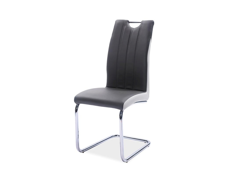 Moderná jedálenská stolička HK-342 s elegantným svetlošedým pásom na boku sedacej aj chrbtovej časti. Stolička je potiahnutá eko-kožou v sivom prevedení, dostupná je aj vprevedení cappuccino. V hornej časti je praktická rúčka na jednoduché prenášanie stoličky. Stolička je vhodná do kuchyne, jedálne i reštaurácie či kaviarne. Podstavec stoličky je z pochrómovaného kovu v tvare písmena U, čo Vám umožní jemné pohojdávanie. Dodávané v demonte.Rozmery stoličky:Celková výška stoličky: 98 cmVýška sedáku: 46 cmHĺbka sedáku: 42 cmŠírka sedáku: 43 cm