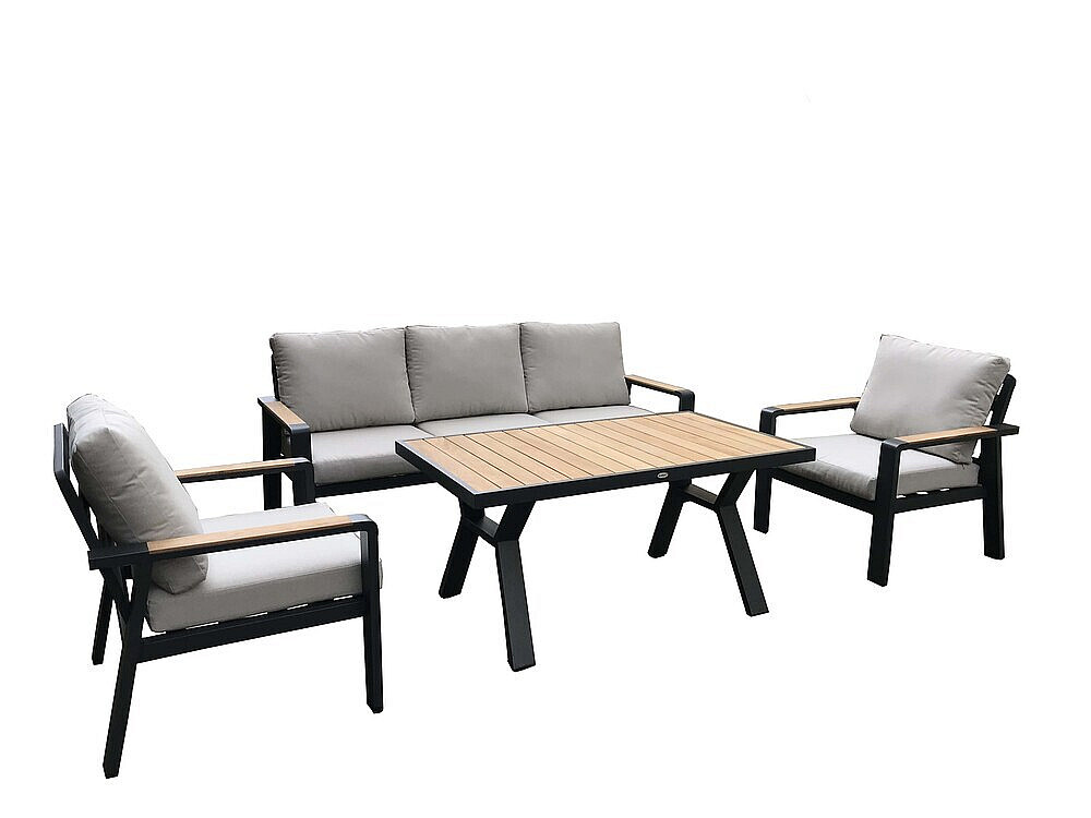 Hliníková zostava pre 5 osôb v grafitovom prevedení, doplnená o tíkové podrúčky a dosku stola.