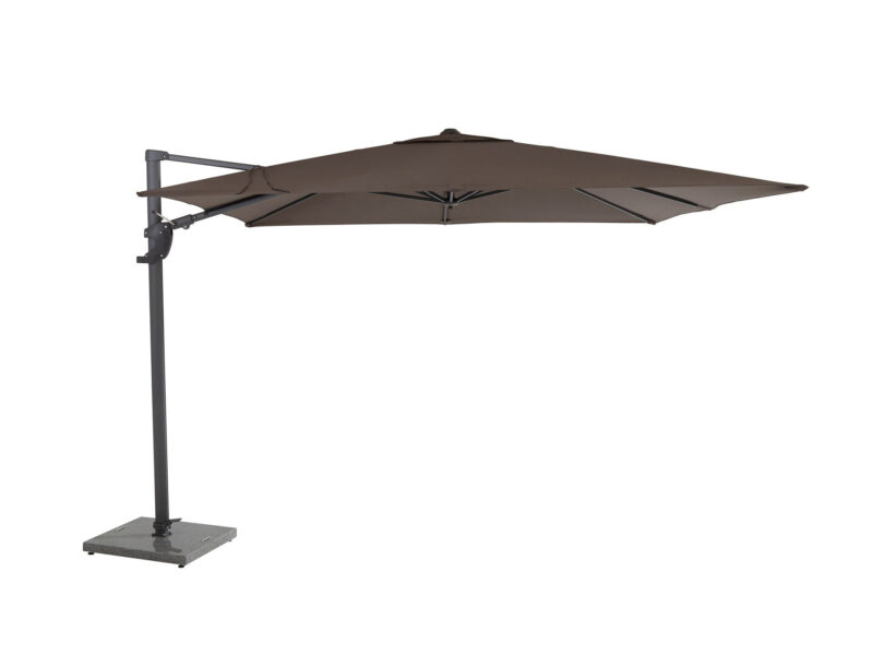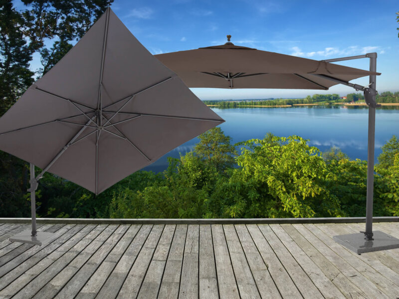 Prémiový závesný slnečník Horizon s konštrukciou z práškovaného hliníka a ocele ponúka stabilitu, tieniacu plochu 300×300 cm a elegantný vzhľad v sivohnedej farbe.