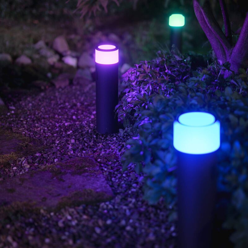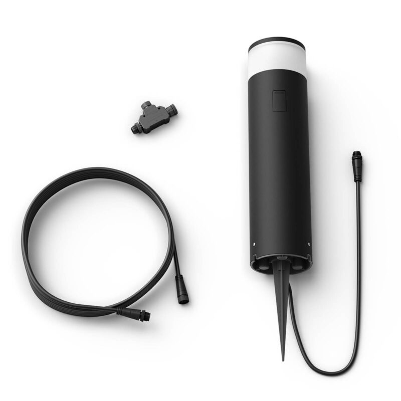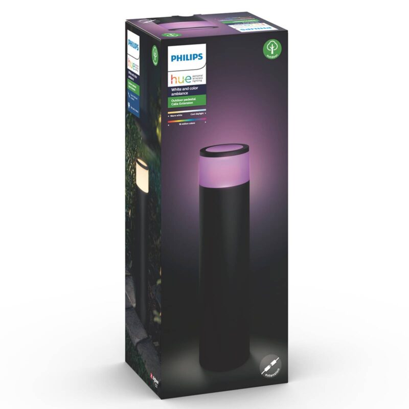 Rozšírenie pre nízkonapäťový systém – stĺpikové LED svietidlo Philips Hue White and Color Calla Moderné stĺpikové LED svietidlo Calla z nízkonapäťového systému Philips Hue je vhodné na rozšírenie základnej súpravy pre exteriéry. Súprava na rozšírenie pozostáva zo stĺpikového svietidla, T konektora, predlžovacieho kábla a hrotu do zeme, ktorý slúži na upevnenie svietidla, napríklad v tráve. Technické údaje/kompatibilita: – funguje len v spojení so základnou súpravou z nízkonapäťového programu Philips Hue – ovládateľné a stmievateľné prostredníctvom aplikácie Hue App – od teplého bieleho svetla (2000 K) až po denné svetlo (6500 K) – 16 miliónov farieb pre pôsobivé exteriérové osvetlenie – kompatibilné so systémom Philips Hue – hlasové ovládanie je možné pomocou asistentov Amazon Alexa, Apple HomeKit a Google Assistant – prepojiteľné s pohybovým snímačom Hue Outdoor (pozri príslušenstvo) – kompatibilné s funkciou Hue Sync – zladenie hudby so svetlom – je potrebné prepojenie so zariadením Hue Bridge (pozri príslušenstvo) Upozornenie: pre bezproblémové fungovanie osvetlenia Hue by malo byť prvé exteriérové svietidlo vzdialené od zariadenia Bridge, ktoré sa nachádza v interiéri, alebo od iného svietidla Hue maximálne 10 metrov. Všetky ostatné svietidlá možno následne inštalovať vo vzdialenosti 20 m. Avšak: čím je vzdialenosť menšia, tým lepšie.