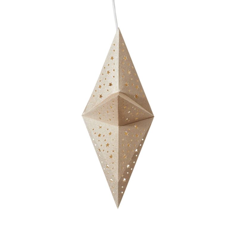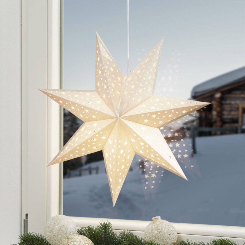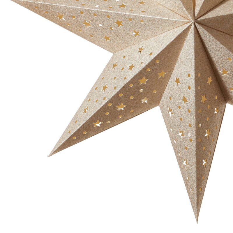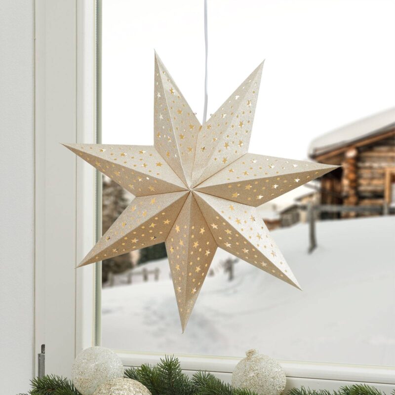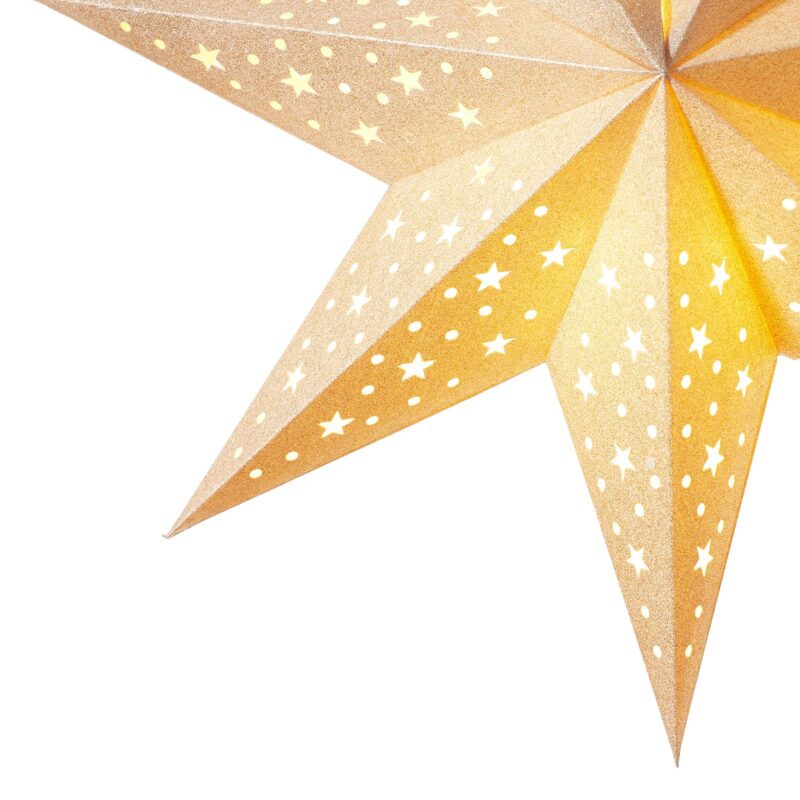 Solvalla – očarujúca závesná hviezda vyrobená z papiera zlatej farby Zlato je jednou z najobľúbenejších farieb dekorácie na Vianoce. Pôsobí slávnostne a záhadne zároveň. Rovnako ako sedemcípa papierová hviezda Solvalla s otvorom a vzorom perforácie hviezd, ktorá po vypnutí vyzerá veľmi pekne. Po zapnutí svetla sa táto atraktívna hviezda rozvinie v úplnej fascinácii. Vypínač pre zapnutie a vypnutie je umiestnený na prívodnom kábli.