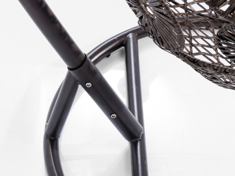 Štýlové závesné kreslo Ibiza v boho štýle s hnedým polyratanovým výpletom a lakovaným kovovým rámom pridáva do exteriéru aj interiéru nezameniteľnú eleganciu a štýl.