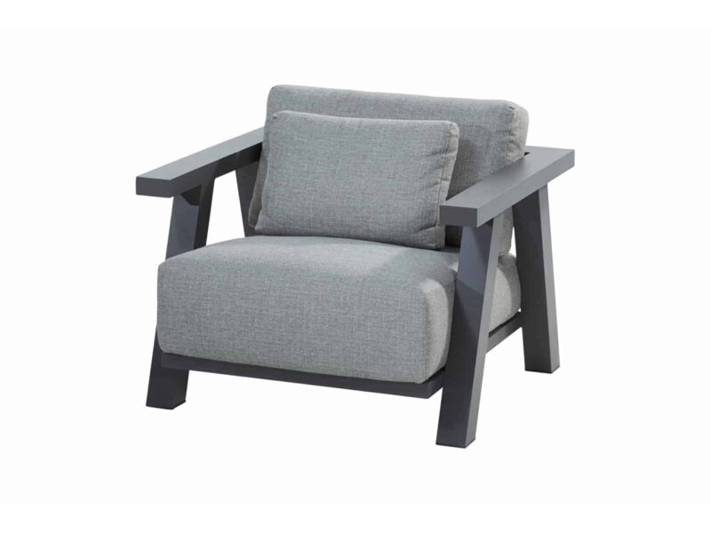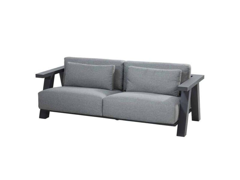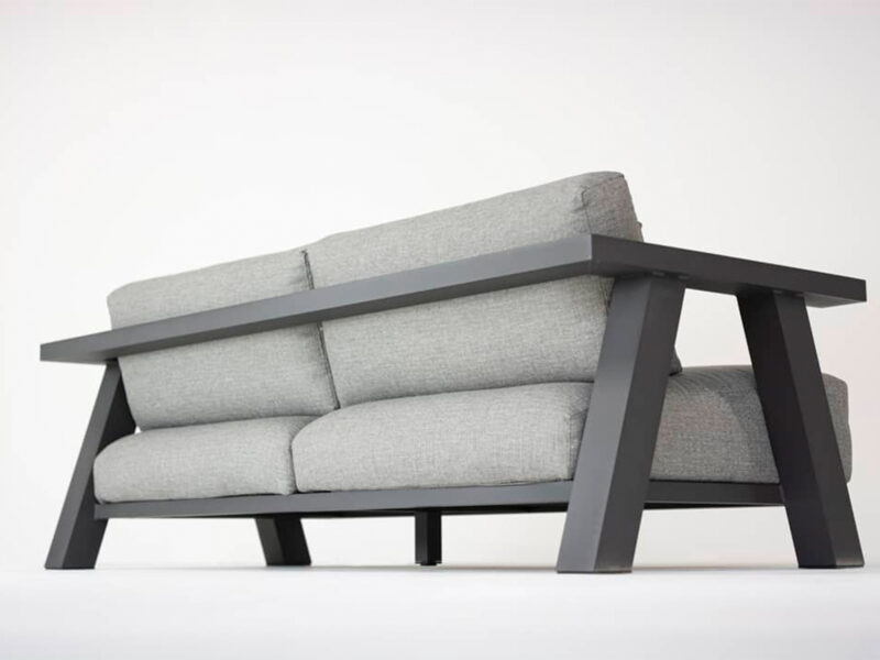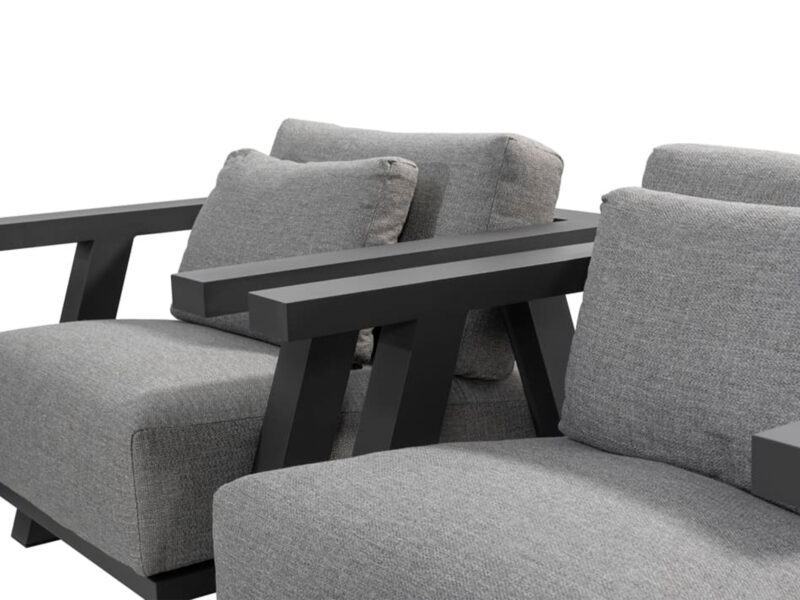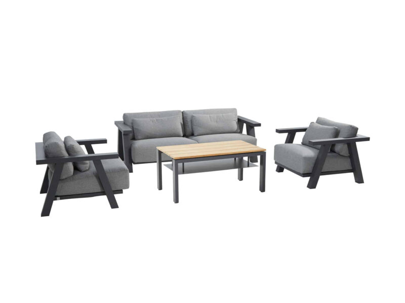 Elegantná sedacia súprava Iconic Forza s hliníkovým rámom, pohodlnými olefínovými vankúšmi a štýlovým teakovým stolíkom s praktickou poličkou. Ideálne riešenie pre moderné vonkajšie posedenie.