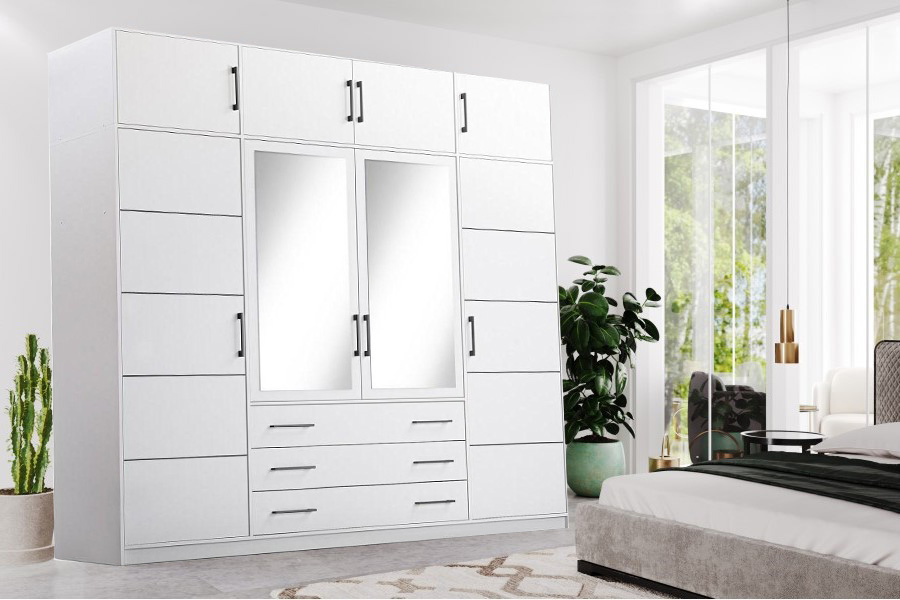 INDI je šatníková skriňa v nadčasovom modernom prevedení, s množstvom úložného priestoru. Je vhodná do moderných interiérov.Táto šatníková skriňa je vyrobená z kvalitných LTD dosiek, ktoré sa jednoducho udržiavajú.Farebné prevedenie: biela.Plastové úchyty v čiernej farbeDisponuje praktickým zrkadlom.Skriňa je štvordverová.Má tri zásuvky.Vo vnútri 8 políc a jedna šatníková tyč.Šatníková skriňa je vrátane nadstavby.Rozmery:šatníková skriňa (š,v,h): 240 x 200 x 57,5 cm.nádstavba (š,v,h): 240 x 45 x 57,5 cm.Dodávame v demontovanom stave.