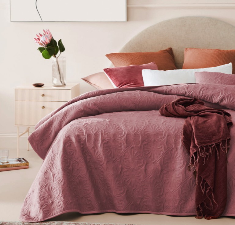 Estetika kolekcie jemne prechádza medzi štýlmi, vyniká nadčasovosťou a vznešeným dizajnom. Jemne prešívané detaily vytvárajú krásny, ornamentálny vzor, ktorý elegantne oživí monochromatický interiér. Hladká, matná látka s lemom na prikrývke spája harmóniu a pohodlie a vytvára útulný priestor, kde môžete relaxovať. Prehoz má obrovský aranžérsky potenciál, obsahuje bohaté spektrum farieb – od pokojných farieb s nádychom tepla až po hlboké výrazné tóny. Perfektný nápad na darček. Vyberte si obliečky na vankúše z rovnakej kolekcie a vytvorte súpravu Leila! Špecifikácie:Certifikát:Oeko-Tex 100 – certifikát bezpečnosti a kvalitykolekcia:Leilamateriál:100% polyesterrozmer:200 x 220 cmFarba:ruža / indická ruža