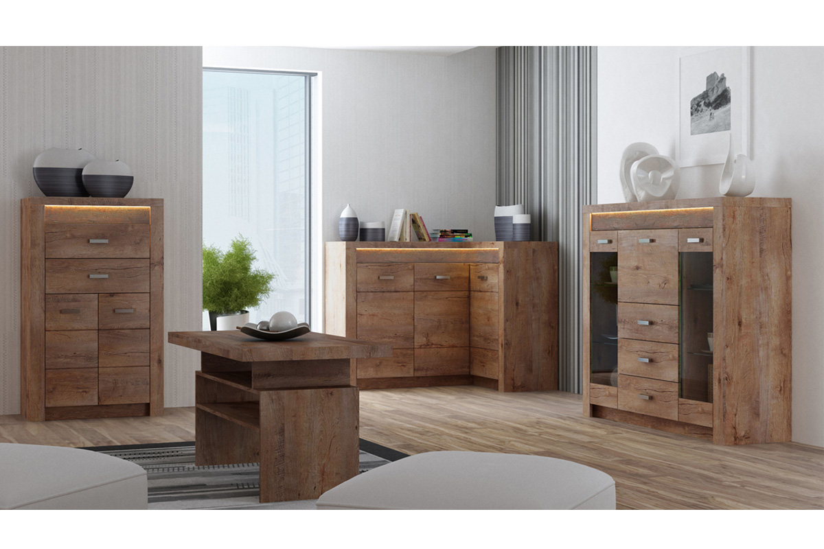 INDIE I je zostava nábytku, ideálna do každej modernej obývačky. Je navrhnutá v nestarnúcom vintage štýle. Jedinečný vzhľad nábytku vnesie do miestnosti nezameniteľnú atmosféru.Tento nábytok sa vyznačuje netradičnou patinovou úpravou povrchu a zaujímavými detailmi, ktoré si viete efektne zvýrazniť LED podsvietením (za príplatok).Nábytok je vyrobený z kvalitnej lamino dosky, ktorá je opatrená ochrannými ABS hranami. Ponúkame Vám ho štýlovom farebnom prevedení jaseň svetlý. Úchyty majú odtieň aluminium.Zostava obsahuje:- komodu INDIE 6. Rozmery (v/š/h) 127 x 76 x 42 cm.- rohovú komodu INDIE 15, v pravom prevedení. Rozmery (v/š/h): 103,5 x 131/90 x 42 cm.- komodu INDIE 8, ktorú môžete využiť aj ako bar. Rozmery (v/š/h) 122 x 137 x 42 cm.Súčasťou zostavy nie je konferenčný stolík. Nájdete ho v našich odporúčaniach. Súčasne ku komodám odporúčame zakúpiť efektné LED podsvietenie komôd ako aj osvetlenie sklenených poličiek v komode I-8 (viď doporučené produkty). V našej ponuke nájdete aj ďalšie prvky INDIE, z ktorých si vytvoríte elegantnú a štýlovú zostavu.Dodávame v demonte