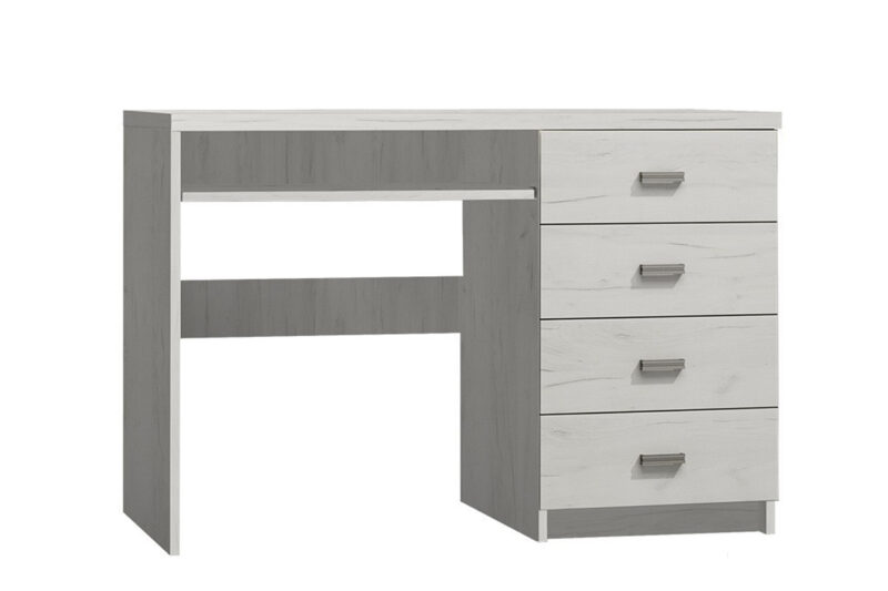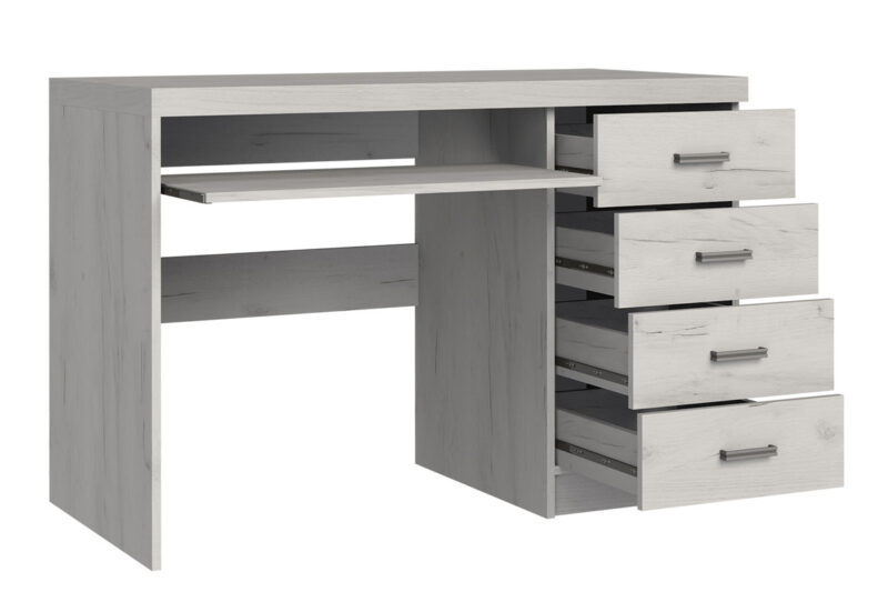 Pracovný stôl I-16 je jedným z 25 prvkov sektorového nábytku INDIE. Tento nábytok je navrhnutý v štýlovom dizajne s jasnou štruktúrou dreva. Spolu s výnimočnou hrúbkou dosky, patinovou úpravou a kovovými úchytmi dáva nábytku rustikálny nádych. Stôl I-16 ponúka efektné riešenie pracovného priestoru. Horná doska s plochou 120 x 60 cm je doplnená praktickou výsuvnou doskou na klávesnicu a zvyšuje komfort pri používaní. Po pravej strane je umiestnený úložný priestor so 4 šuplíkmi. Nábytok je vyrobený z kvalitnej LTD dosky, ktorá je opatrená ochrannou ABS hranou. Farebné prevedenie: craft biely. Úchyty majú odtieň aluminium. Rozmery (v/š/h): 77 x 120 x 60 cm. Hrúbka dosky je 16 /48 mm. Dodávame v demontovanom stave.Sektorový nábytok INDIE je v ponuke v 3 farebných odtieňoch: jaseň tmavý, jaseň svetlý alebo craft biely. Ponúka viacero elementov, z ktorých si môžete zariadiť útulnú obývačku, jedáleň, spálňu ale aj pracovňu. Variabilita a funkčnosť nábytku zaručí praktické využitie priestoru. Jedinečný vzhľad nábytku vnesie do každej miestnosti nezameniteľnú atmosféru a dodá mu šmrnc.