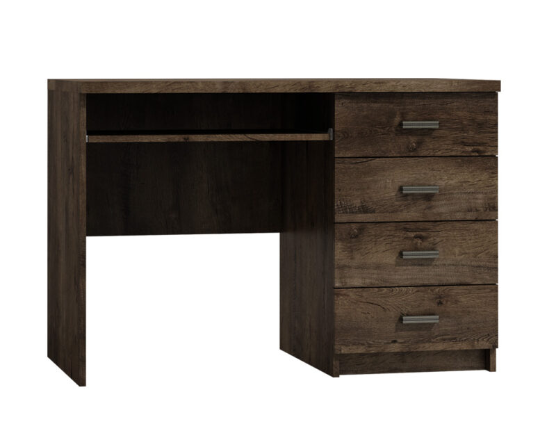 Pracovný stôl I-16 je jedným z 25 prvkov sektorového nábytku INDIE. Tento nábytok je navrhnutý v štýlovom dizajne s jasnou štruktúrou dreva. Spolu s výnimočnou hrúbkou dosky, patinovou úpravou a kovovými úchytmi dáva nábytku rustikálny nádych. Stôl I-16 ponúka efektné riešenie pracovného priestoru. Horná doska s plochou 120 x 60 cm je doplnená praktickou výsuvnou doskou na klávesnicu a zvyšuje komfort pri používaní. Po pravej strane je umiestnený úložný priestor so 4 šuplíkmi. Nábytok je vyrobený z kvalitnej LTD dosky, ktorá je opatrená ochrannou ABS hranou. Farebné prevedenie: jaseň tmavý. Úchyty majú odtieň aluminium. Rozmery (v/š/h): 77 x 120 x 60 cm. Hrúbka dosky je 16 /48 mm. Dodávame v demontovanom stave.Sektorový nábytok INDIE je v ponuke v 3 farebných odtieňoch: jaseň tmavý, jaseň svetlý alebo craft biely. Ponúka viacero elementov, z ktorých si môžete zariadiť útulnú obývačku, jedáleň, spálňu ale aj pracovňu. Variabilita a funkčnosť nábytku zaručí praktické využitie priestoru. Jedinečný vzhľad nábytku vnesie do každej miestnosti nezameniteľnú atmosféru a dodá mu šmrnc.