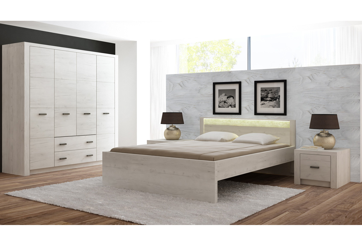 INDIE je zostava nábytku, ideálna do každej modernej spálne. Je navrhnutá v nestarnúcom vintage štýle. Jedinečný vzhľad nábytku vnesie do miestnosti nezameniteľnú atmosféru. Tento nábytok sa vyznačuje netradičnou patinovou úpravou povrchu a zaujímavými detailmi, ktoré si viete efektne zvýrazniť LED podsvietením (za príplatok). Nábytok je vyrobený z kvalitnej lamino dosky, ktorá je opatrená ochrannými ABS hranami. Ponúkame Vám ho štýlovom farebnom prevedení kraft biely. Úchyty majú odtieň aluminium.Zostava obsahuje:- Štvordverovú šatnú skriňu I-18. Rozmery (v/š/h): 214 x 178 x 58 cm.- Manželskú posteľ I-19. Súčasťou postele je rošt. Matrac je potrebné dokúpiť. Odporúčame rozmer 160 x 200, resp. 2 ks 80 x 200 cm. Ku posteli Vám ponúkame za príplatok aj efektné LED osvetlenie pre zvýraznenie štýlového prevedenia hornej časti čela postele. Rozmery (v/š/h): 100 x 170 x 210 cm.- 2 ks nočný stolík I – 24, s možnosťou ľubovoľne ho zmontovať s ľavým alebo pravým otváraním dvierok, v závislosti od toho, ako potrebujete. Rozmery (š/v/h): 45 x 55 x 42 cmKu posteli si môžete doobjednať praktickú zásuvku na odkladanie rôznych predmetov či textílií. V našej ponuke nájdete aj ďalšie prvky INDIE, z ktorých si vytvoríte elegantnú a štýlovú zostavu.Dodávame v demonte