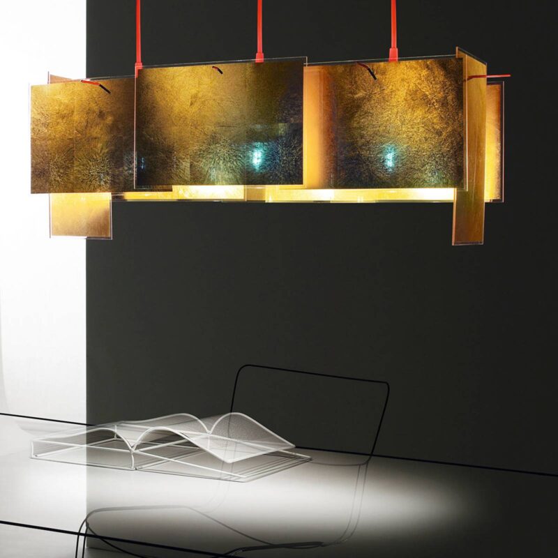 24 Karat Blau M – doplnková sada na závesnú lampu 24 Karat Blau S doplnkovou sadou 24 Karat Blau M je možné dizajnovú závesnú lampu 24 Karat Blau od Inga Maurera rozšíriť o približne jednu šírku clony. Použitie niekoľkých sád umožňuje individuálny návrh rôznych zoskupení jednotlivých svetiel – od trojíc až po veľké komplexy svietidiel. Súčasťou dodávky sú dve akrylové clony s liatym lístkovým zlatom, dva spojovacie prvky, tyčový kríž, baldachýn, kábel a objímka vrátanie žiaroviek a reflektora. Tyčové kríže sú navzájom prepojené spojovacími prvkami.