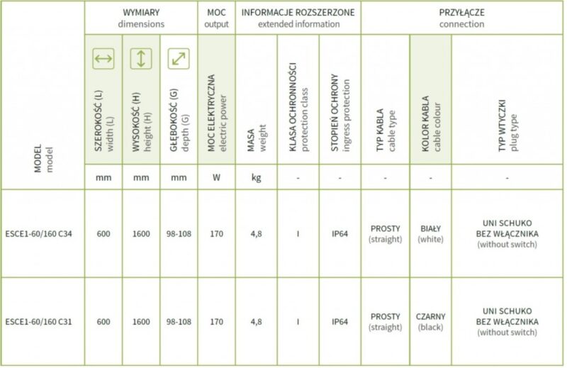 Elektrický sušiak uterákov ESCADA 1 do moderného interiéru s hĺbkou iba 10 cm – v bielej a čiernej farbe sú nielen rúrky a uchytenie, ale aj napájací kábel a elektrická zástrčka. Sušiak je možné nainštalovať na stenu ako závesný sušiak alebo o stenu oprieť a zafixovať hornými úchytmi. Vnútri vykurovacieho telesa je umiestnený odporový drôt. Sušiak je vyrobený z profilov okrúhleho prierezu ⌀ 38 mm/ ⌀ 22 mm. Elektrický sušiak udržuje cez deň uteráky, utierky a osušky svieže. Jeho úžitkové vlastnosti vyniknú najmä v čase mimo vykurovacej sezóny. Konštrukcia sušiaku umožňuje jeho stále zapojenie do siete . Zahriatie na úžitkovú teplotu trvá cca 15 minút. Povrchová prevádzková teplota je cca 45 °C. Dvojitá izolácia, odolnosť proti tryskajúcej vode – krytie IP 64. Pri každom modeli Escada Electro je spínač zabudovaný v zadnej časti rúrky okolo hornej časti sušiaku . Nie je teda vidieť spredu ani z boku. Nízka spotreba el. energie . Vnútri sušiaku je iba odporový drôt , teda nie je potrebné ho napúšťať žiadnou plniacou tekutinou. Rozmerové varianty: 600 × 1600 mm, 160 W Materiál: prevedenie bočná oceľová rúrka s priemerom 38 mm, stredová 22 mm – okrúhle rúrky povrchová ochrana je prevedená práškovou farbou za tepla (komaxit) Farebné prevedenie: C31 čierna matná C34 biela matná ZÁRUKA 15 ROKOV(GT) Ean: 8596462552895