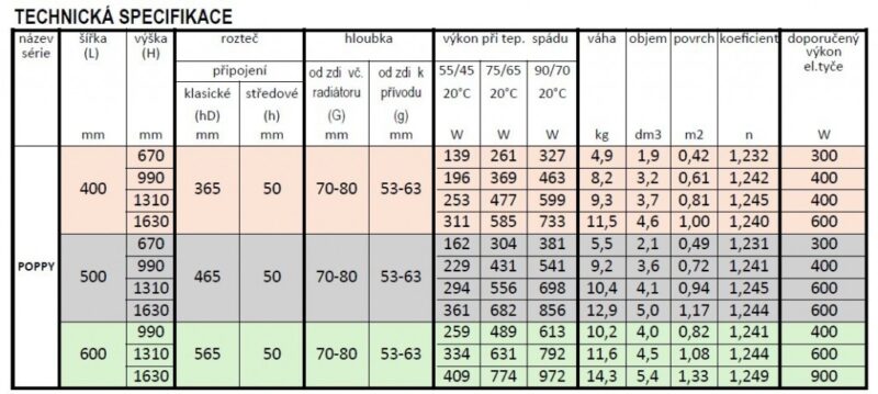 Radiátor, ktorý vždy prekvapí. Tvary radiátora Poppy sú dokonale zladené so súčasnými módnymi hranatými kúpeľňovými armatúrami. Je hravý a pritom veľmi praktický a je dostupný v mnohých farebných variantoch. Kúpeľňové radiátory sú vhodné na klasické vykurovanie aj na použitie vykurovacej tyče . Odporúčané armatúry: Z2 Z6 Z7 Z8 Radiátor je možné objednať s príplatkovou výbavou Príplatok – Elektrický radiátor a vďaka tomu dostanete čisto elektrický radiátor ( s už osadenou vykurovacou tyčou HOT a naplnený špeciálnou nemrznúcou teplonosnou zmesou do vykurovacích telies ). Elektrické radiátory nie sú pripojené na rozvody TÚV, ľahko ho zapojíte iba do elektrickej zásuvky a užívate si teplo v kúpeľni kedykoľvek chcete. Kúpeľňové radiátory HOPA kompletne zmenia vaše predstavy o radiátoroch ako ich poznáte. Vďaka moderným technológiám a materiálom sú radiátory do kúpeľne opatrené dokonalou antikoróznou vrstvou. Na túto vrstvu je ešte len nanášaná prášková farba. Kúpeľňový radiátor je vhodný k jedno aj dvojrúrkovým vykurovacím systémom s čerpadlom. Alebo ako samostatné vyhrievacie telesá s elektrickou vykurovacou tyčou. Radiátory majú menší objem vody, veľmi rýchlo sa zahrievajú a sú výborne regulovateľné, takže si jednoducho nastavíte tú správnu teplotu pre váš dokonalý komfort. Radiátory sú dodávané BEZ vykurovacej tyče, za rozmerom je iba uvedený vhodný výkon tyče pre patričný rozmer. Dostupné rozmery radiátora POPPY kúpeľne: 400 × 670 mm, výkon 261 W, (vykurovacia tyč 300 W) 400 × 990 mm, výkon 369 W, (vykurovacia tyč 300 W) 400 × 1 310 mm, výkon 477 W, (vykurovacia tyč 300 W) 400 × 1 630 mm, výkon 585 W, (vykurovacia tyč 600 W) 500 × 670 mm, výkon 304 W, (vykurovacia tyč 300 W) 500 × 990 mm, výkon 431 W, (vykurovacia tyč 300 W) 500 × 1 310 mm, výkon 556 W, (vykurovacia tyč 600 W) 500 × 1 630 mm, výkon 682 W, (vykurovacia tyč 600 W) 600 × 990 mm, výkon 489 W, (vykurovacia tyč 600 W) 600 × 1 310 mm, výkon 631 W, (vykurovacia tyč 600 W) 600 × 1 630 mm, výkon 774 W, (vykurovacia tyč 900 W) Pripojenie radiátora: Radiátor 400 mm – spodný 365 mm Radiátor 500 mm – spodný 465 mm Radiátor 600 mm – spodný 565 mm Farby podľa vzorkovníka, uvedená cena je už konečná: C12 graphite C15 granite C16 anthracite C17 silver C18 aluminium C19 grey C31 black mat C33 black structure C34 white mat C36 white structure C37 white chocolate C42 cappuccino C43 cinnamon C44 cardamom C57 ice cream C69 sparrow C70 moon C71 grey wall C73 sal t & pepper C75 black swan C76 black horse C84 gold (NOVINKA) Pokiaľ si teda rozhodnete pre farebné prevedenie radiátora, tak si prosím vo vzorkovníku (nižšie na stránkach na stiahnutie) vyberte farbu a názov s číselným označením farby vložíte do poznámky pri objednávke. Radiátory v takto zvolenom variante sú iba na objednávku, dodacia doba je 4 až 6 týždňov. ZÁRUKA 15 ROKOV(GT)