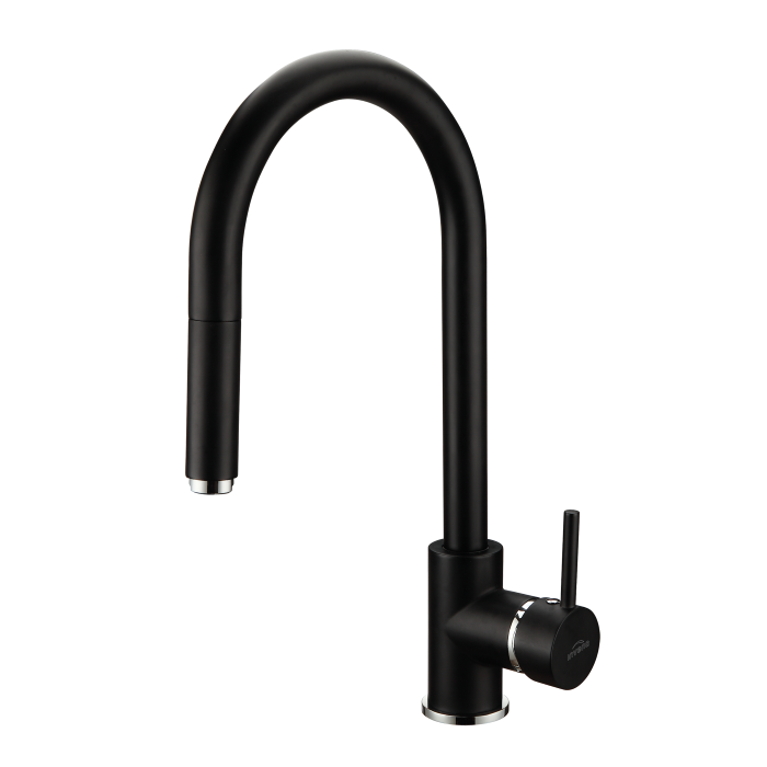 Drezová batéria DUET s výsuvným výtokom je zhotovená v modernom štýle. Je pokrytá vrstvou chrómu nalakovanú v elegantnej čiernej farbe. Inštalácia je určená na drez či dosku.
