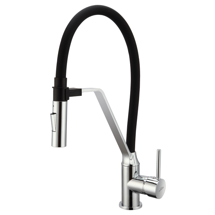 Drezová batéria s magnetickou rukoväťou je veľmi kvalitná jednopáková kuchynská batéria s flexibilným dvojfunkčným výtokom (normálny prúd, rozstrek). Flexibilná silikónová hadica a magnetická rukoväť dovoľuje pohodlné každodenné použitie. Pomocou páky je možné nastaviť správna teplota a prúd vody.