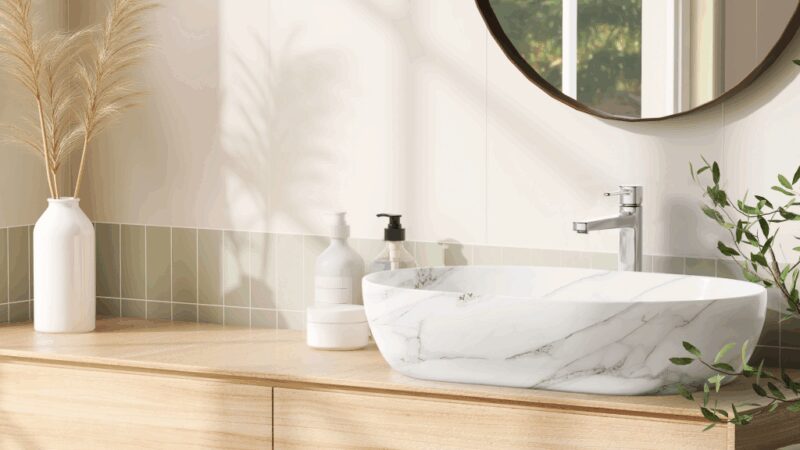 Efekt bieleho lesklého mramoru pôsobí mimoriadne šik a elegantne. Umývadlo na dosku KORFU bude vyzerať skvele s vysokými umývadlovými batériami alebo batériami pod omietku.