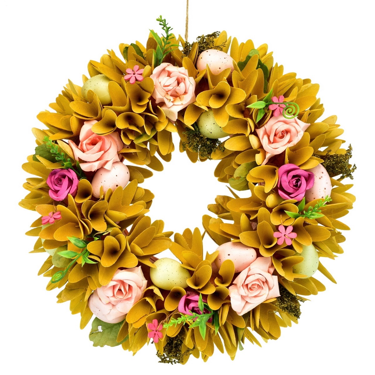 Tento štýlový veniec je ozdobený jemnými kvetmi ružičiek v pastelových farbách a plastovými vajíčkami, čo evokuje jarnú pohodu a blížiace sa sviatky Veľkej noci. Je vyrobený z kvalitných drevených hobliniek, ktoré dodávajú výrobku prírodný a rustikálny vzhľad. Perfektná voľba pre každú jarnú dekoráciu.