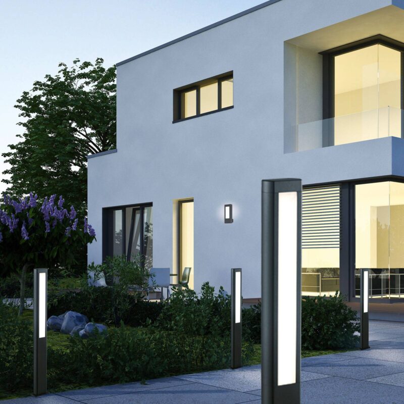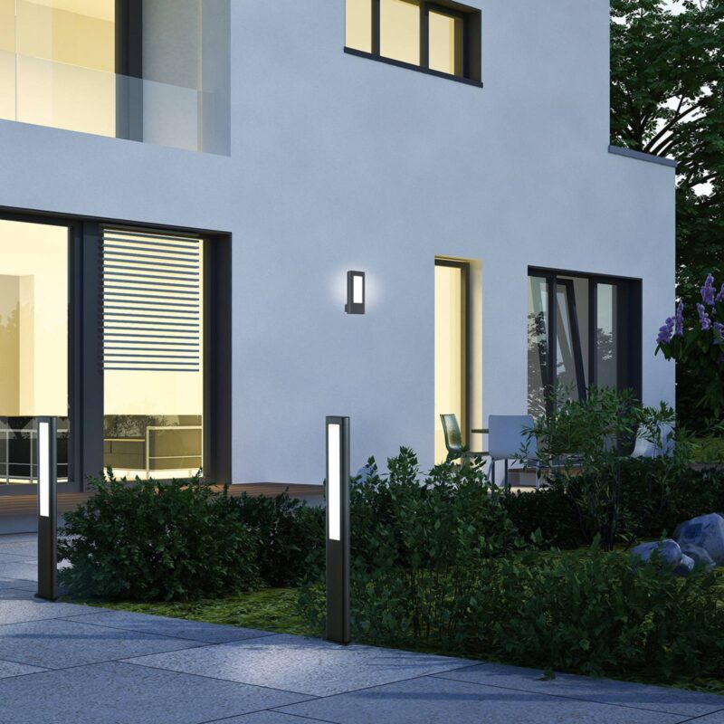 Robustne vyhotovené exteriérové nástenné LED svietidlo Rhine Vzhľad exteriérového nástenného LED svietidla Rhine zhotoveného z hliníkovej liatiny je charakterizované priamymi líniami a nadčasovou modernosťou. Svetelný zdroj pre exteriérové osvetlenie, ktoré možno kombinovať s mnohými štýlmi fasád. Obidve zabudované LED žiarovky vytvárajú svetlo žiariace teplou bielou farbou, ktorá jemne osvetľuje prostredie a pôsobí veľmi príjemne. So stupňom ochrany IP54 je exteriérové nástenné LED svietidlo Rhine chránené aj proti extrémnym poveternostným vplyvom.