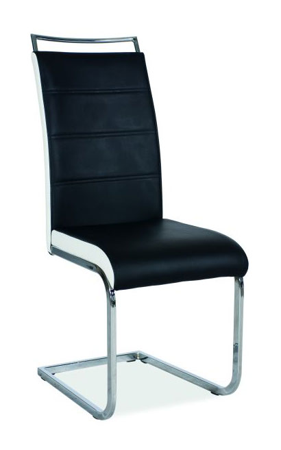Kovová stolička HK-441 do jedálne. Stolička má čalúnenú sedaciu časť čiernou ekokožou, boky sú potiahnuté bielou. Zaujímavé kovové nožičky sú elegantne pochrómované. Výška sedu 48 cm. Rozmer (v/š/h) 102 x 43 x 55 cm. Dodávame v demonte. Stoličku HK-441 ponúkame aj v opačnej farebnej kombinácii.