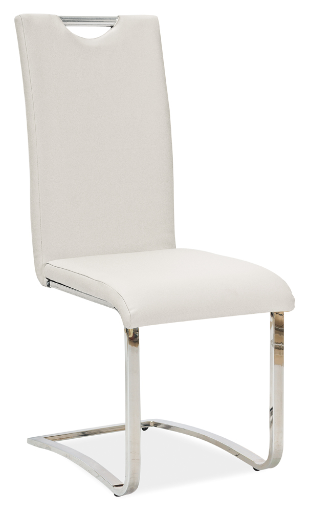 Akciová cena je za tovar skladom. Tovar sa dopredáva. Skladom posledný kus, nedá sa viac objednať. Moderná jedálenská stolička HK-790. Stolička je potiahnutá bielou eko-kožou. Stolička je dostupná aj v čiernej, tmavobéžovej a šedej farbe. V hornej časti je otvor na jednoduché prenášanie stoličky. Stolička je vhodná do kuchyne, jedálne i reštaurácie či kaviarne. Podstavec stoličky je z pochrómovaného kovu v tvare písmena U, čo Vám umožní jemné pohojdávanie.Dodávané v demonte.Rozmery stoličky: Celková výška stoličky: 101 cm Výška sedáku: 47 cm Hĺbka sedáku: 43 cm Šírka sedáku: 42 cmUpozornenie: Vyvarujte sa sedeniu na stoličke v oblečení, ktoré má tendenciu púšťať farbu. Na bielej/svetlej ekokoži by to mohlo zanechať neodstrániteľné stopy.