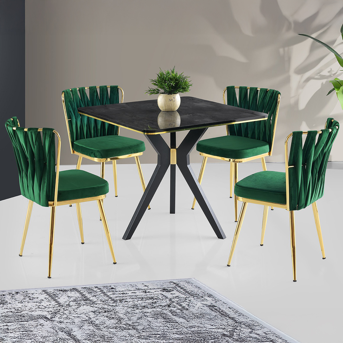 Náš jedálenský stôl je vyrobený zo 100% MDF a vyznačuje sa elegantným a moderným dizajnom, ktorý ľahko doplní akýkoľvek štýl interiéru. Kombinácia čiernej a zlatej farby mu dodáva nádych luxusu, takže sa stane skutočným výnimočným kúskom vo vašej domácnosti. Jeho robustné plastové nohy poskytujú stabilitu a zabezpečujú dlhú životnosť, takže si budete môcť užívať nespočetné jedlá a stretnutia po mnoho rokov.