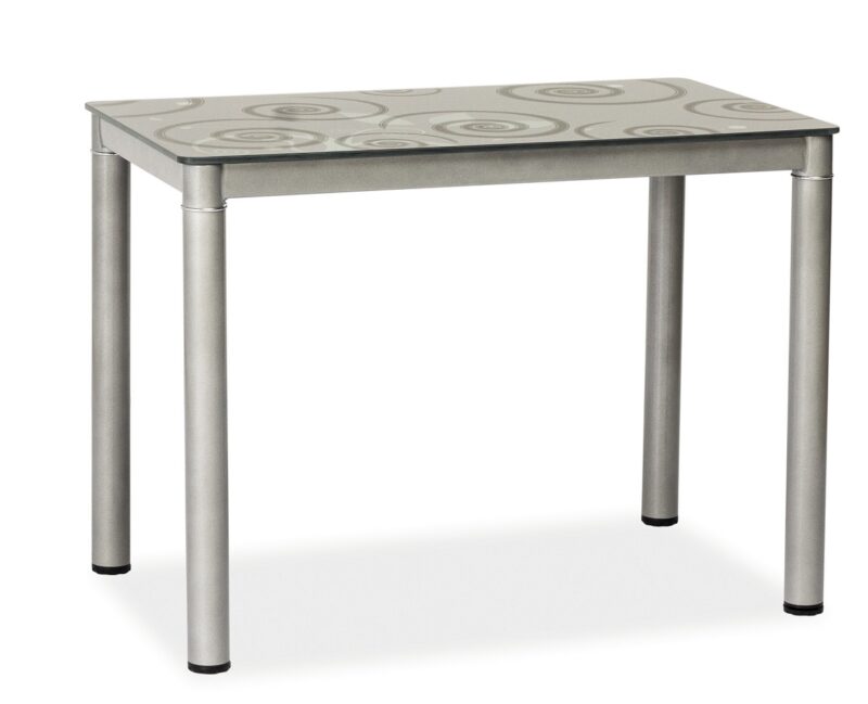 Zaujímavý stôl do jedálne TAMAR s dekoračným vzorom pod vrchnou sklenenou doskou. Konštrukcia je z kovu v šedej farbe, vrchná doska je z tvrdeného šedého skla so vzorom kvetov. Je vhodný pre 4 osoby. Dodávame v demonte. V ponuke aj biely, čierny, tmavobéžový a krémový stôl. Rozmery (výška/šírka/hĺbka v cm): 75/100/60