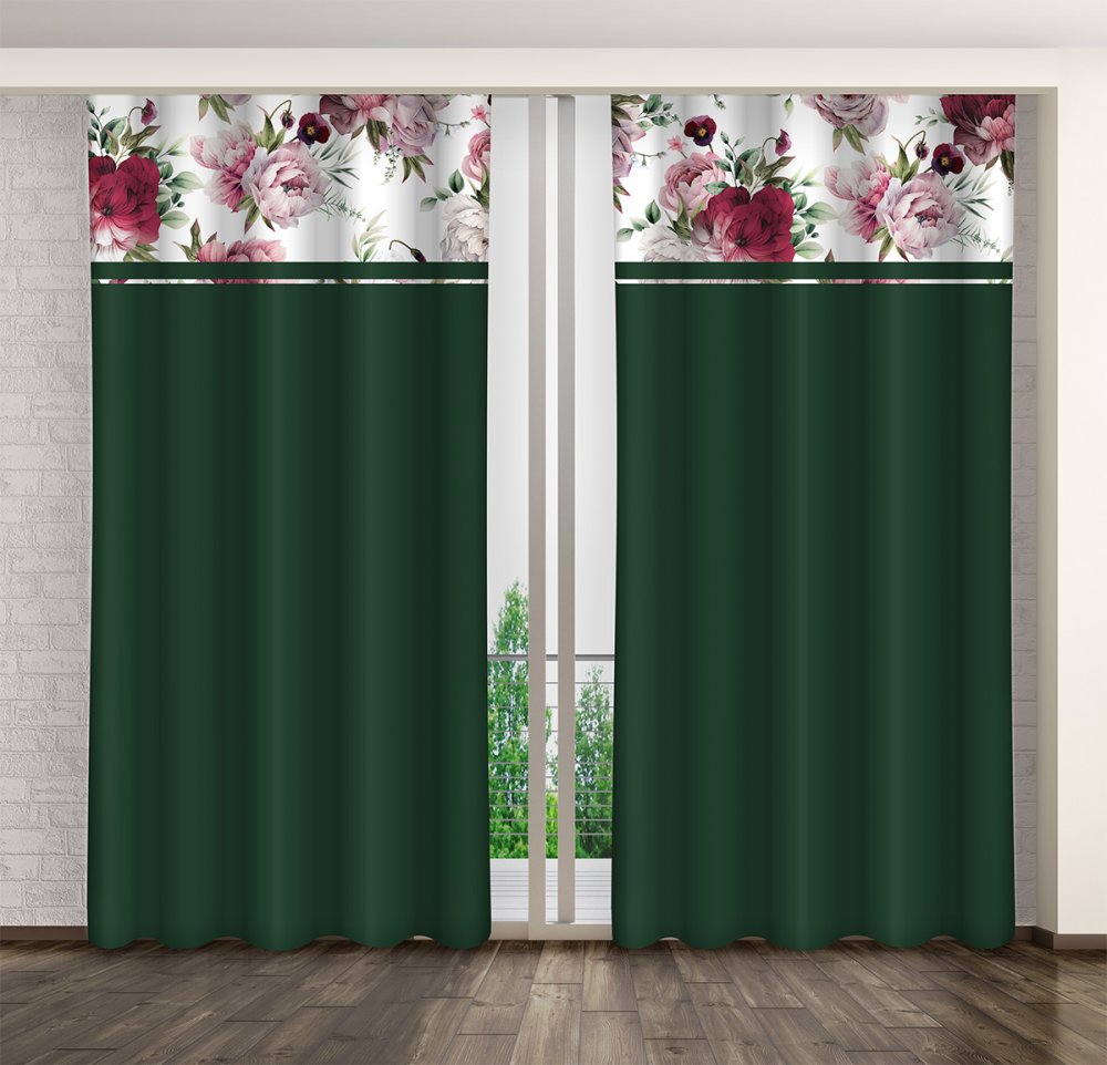 Jednoduchý tmavozelený záves s potlačou ružových a bordových pivónií Šírka: 160 cm | Dĺžka: 250 cm
