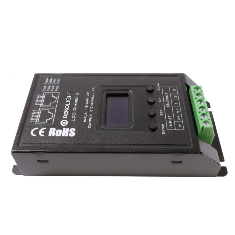Kapego OLED stmieva? 3 na použitie ako 1-kanálový alebo 3-kanálový stmieva? Tento stmieva? s OLED displejom je možné použiť pre zariadenia s jedným alebo tromi kanálmi. Kanály je možné jednotlivo stlmiť pomocou manuálneho režimu (zmena farby). stmieva? ponúka 27 programov na zmenu farieb. S funkciou master / slave. – Všetky funkcie je možné vyvolať prostredníctvom OLED displeja – s 2 m káblom CAT5 (RJ45) – Pripojenie: štyri svorky (R, G, B, V +) – Ovládanie: DMX512, manuálne, automatické – maximálny výkon: 240 W pri 12 V, 480 W pri 24 V. – maximálny výstupný prúd: 6 A na kanál