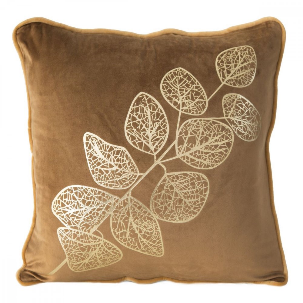 Karamelovo hnedá zamatová obliečka na vankúš so zlatým motívom ginkga 45 x 45 cm