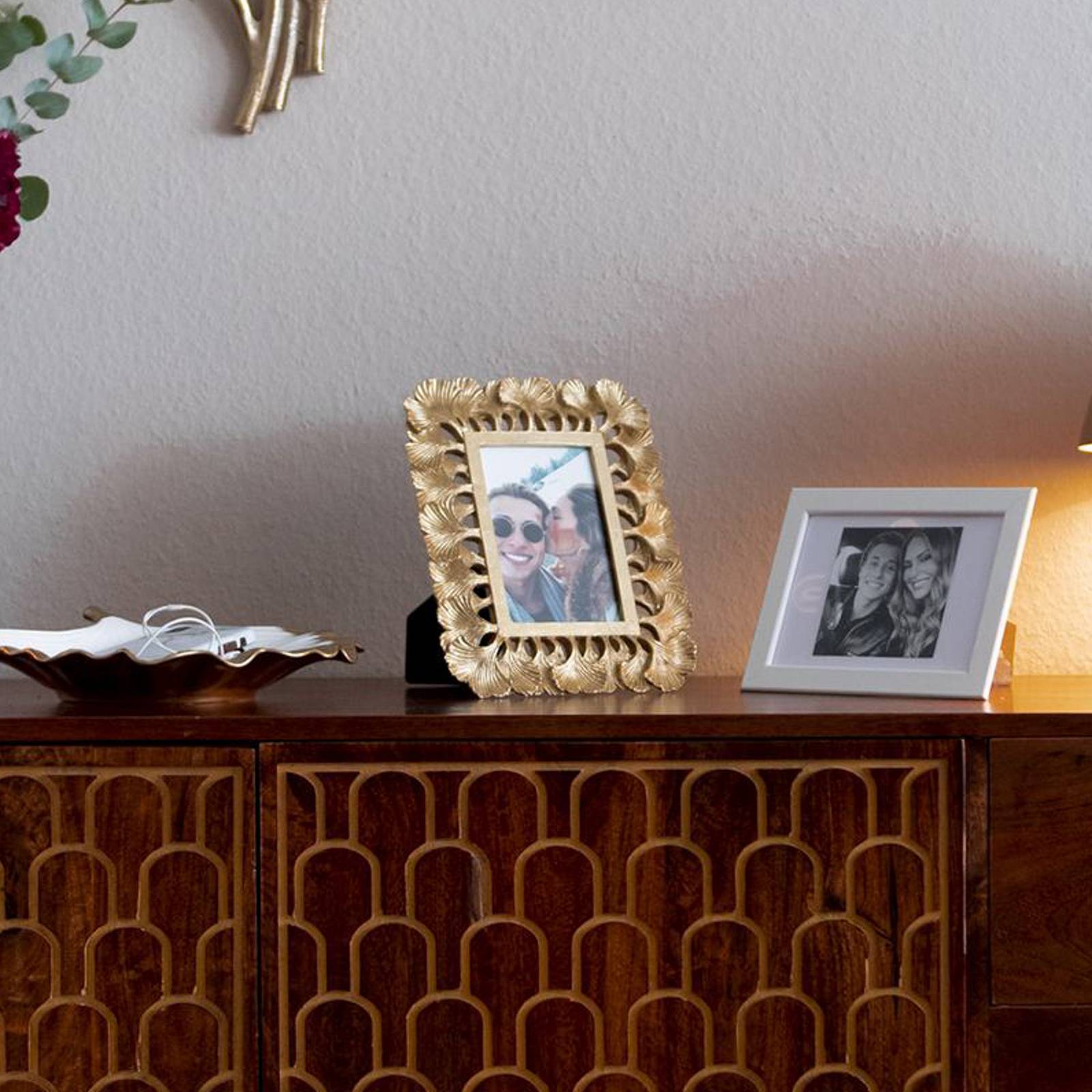 Rámik na obraz Ginko na veľkosť obrazu 10 x 15 cm, ručne vyrobený z polyresinu Obdĺžnikový rámik na obraz Ginko v zlatej farbe dodá každej obľúbenej fotografii šmrnc! Jednotlivé listy ginka vyčnievajú po celom obvode štvorcového rámu a dekoratívne prezentujú fotografiu. Elegantný a vysokokvalitný: každý rám je jedinečný a vyrobený ručne. Značka Kare znamená jedinečné nápady na bývanie, nekonformné a autentické, nikdy nie nudné a vždy plné fantázie a inšpirácie. Priehľadné sklo chráni fotografiu.