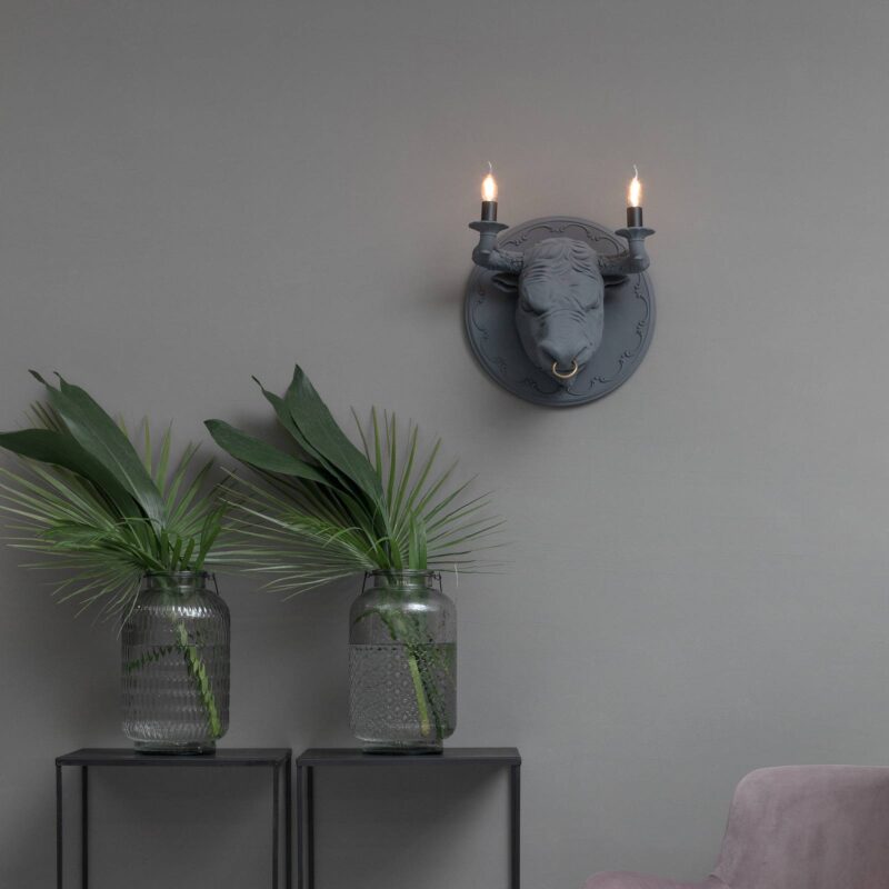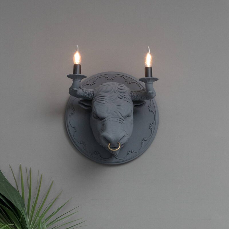 Extravagantné nástenné svietidlo Premium Corrado Dokonalý pútač pozornosti na chodbách a v obývacích izbách: nástenné svietidlo Corrado je navrhnuté v tvare býčej hlavy, ktorá visí z okrúhlej nástennej rozety. Dva rohy slúžia ako držiaky pre dve pätice E14. Aby ste dizajnu nábytku učinili zadosť, odporúčame zvoliť žiarovky v tvare sviečok (pozri príslušenstvo). Corrado je vyrobený prevažne z keramiky, len krúžok na nose je z mosadze. Výrobca Karman je známy netradičným dizajnom. Spolu s Matteom Ugolinim vyrába talianska spoločnosť svetelné zdroje, ktoré dodávajú domácnosti úplne novú estetiku.
