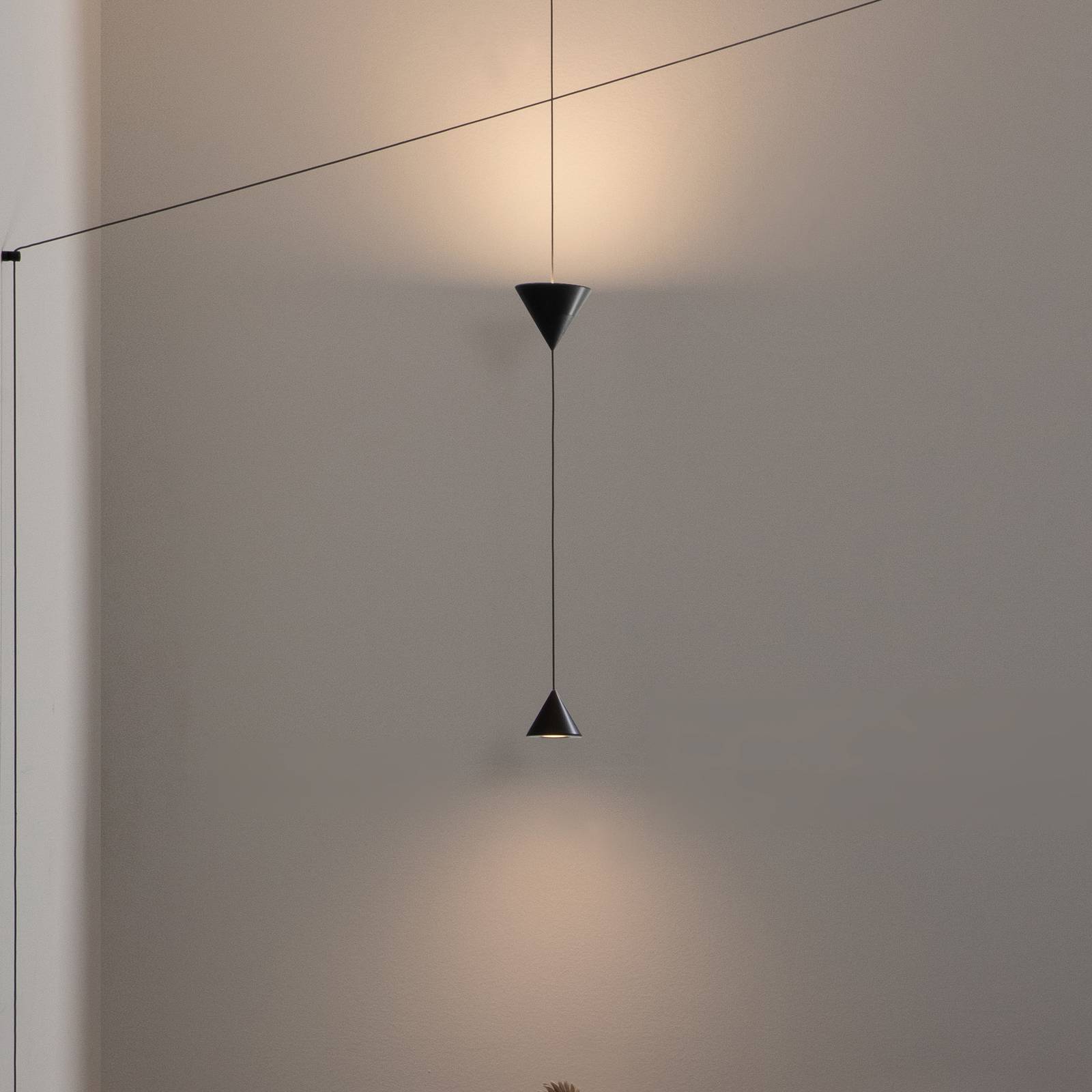 Moderné podlahové svietidlo Filomena LED pre individuálne možnosti dizajnu Filomena je úplne čierna a pozostáva zo základne, osemmetrového kábla a dvoch hliníkových tienidiel v tvare kužeľa, ktoré svietia smerom nadol a nahor. Pri montáži svietidla sa kreativite medze nekladú. Kábel v rovnej línii alebo cik-cak, tienidlá zatvorené pod stropom alebo skôr tesne nad pultom – Filomena ponúka individuálne možnosti dizajnu. V koncepcii však dizajnér nezohľadnil len vizuálnu stránku. Ak potrebujete zdroj svetla na mieste, kde nie je priame napájanie, Filomena sa dá namontovať tak, že nie je potrebné inštalovať nevzhľadné káblové kanály. Myslelo sa aj na zdroj svetla. Jas teplých bielych LED diód možno nastaviť na požadovanú intenzitu pomocou prepínača na základni. – Súčasťou dodávky sú dva montážne háčiky