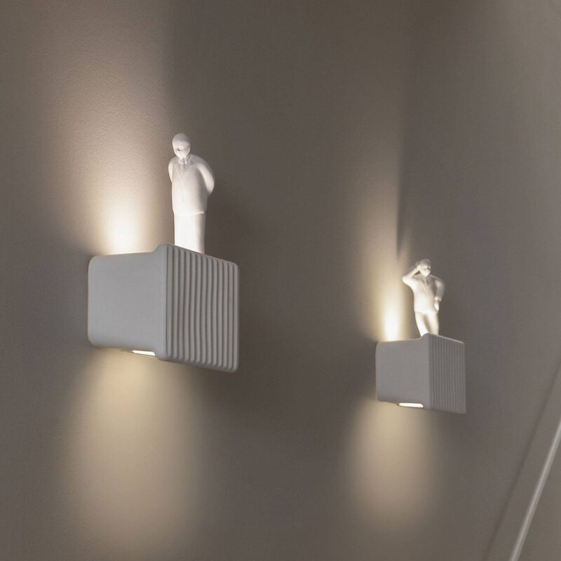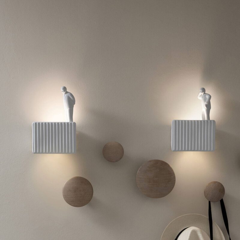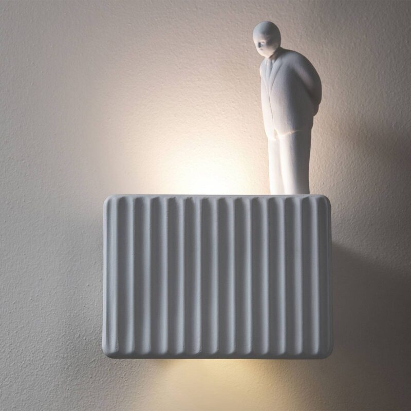 Dekoratívna figúrka na LED nástenné svietidlo Umarell Táto dekoratívna figúrka z bielej keramiky dotvára koncept nástenného svietidla Umarell LED od spoločnosti Karman. Dizajnér Giorgio Biscaro sa inšpiroval motívom, ktorý nájdete na mnohých miestach v Taliansku. Tu seniori so záujmom sledujú, čo sa deje na stavbách vo verejnej oblasti (taliansky Umarell), aby trávili čas. Zdá sa, že pomocou nástennej lampy Umarell figúry skúmajú šírenie svetla a sami si ich dávajú do deja – rovnako ako živé Umarells, ktorým sa ich pozornosť a vlastné označenie dostalo až vďaka ich opakujúcej sa prítomnosti na stavenisku.