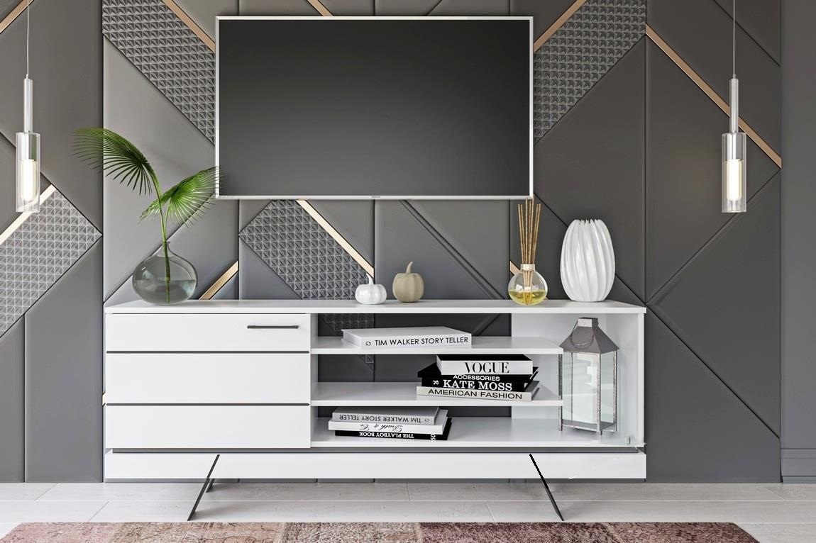 Televízny stolík KAROLINE poteší všetkých milovníkov industriálneho štýlu. Nadčasová biela farba vytvára príjemný kontrast s čiernymi dekoratívnymi pásmi na čelách nábytku a s kovovými úchytmi. Čierne kovové nohy dodávajú stolíku nielen moderný ráz, ale predovšetkým stabilitu. Stolík je jednodverový, dostatok priestoru napr. na set top box alebo ovládače získate vďaka odkladacím policiam.Je vyrobený z kvalitnej LTD dosky nenáročnej na udržiavanie.Rozmery (ŠxVxH): 160 x 65 x 35 cm.Dodávame v demonte