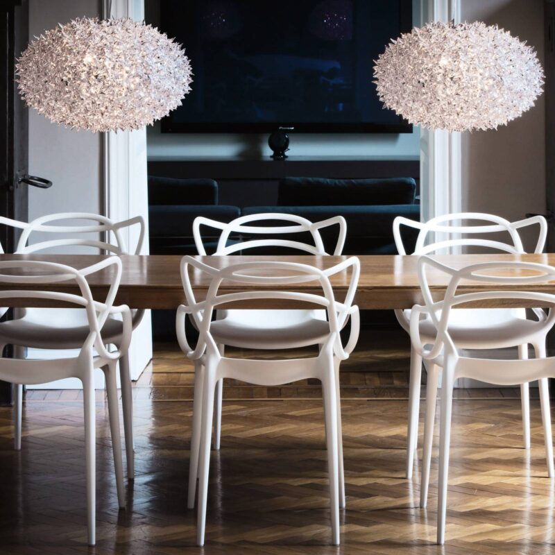 Dizajnové závesné svietidlo Bloom S1 od Ferruccio Laviani Prostredníctvom niekoľkých osvetľovacích telies umiestnených na vnútornej strane tienidla sa malé kvety s dvojitou korunou osvetľujú zvonku a šíria tak do miestnosti tisíckrát znásobené odrazy svetla. Lampa, ktorú navrhol taliansky dizajnér Ferruccio Laviani, je kompletne vyrobená z polykarbonátu a zodpovedá tak ochrannej známke výrobcu Kartell. Talianska značka Kartell už od roku 1949 vyrába svietidlá a tiež ďalšie kusy nábytku z plastov, ktoré sú spracované čo najefektívnejšie a najšetrnejšie k materiálu. V centre pozornosti je vždy najvyššia kvalita a vysoký technologický štandard.