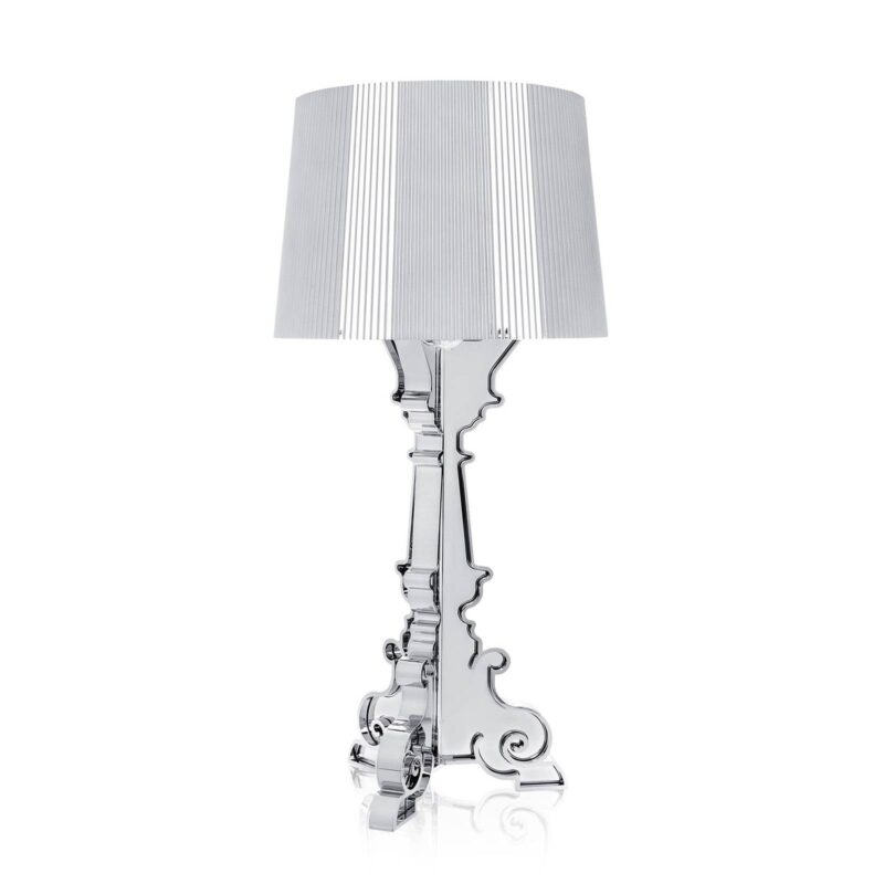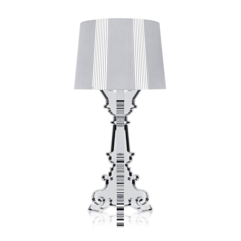 Strieborná dizajnová stolová lampa Bourgie Tento model stolovej lampy Bourgie je vyrobený z polykarbonátu striebornej farby. Na jednej strane sa hlavný dôraz kladie na podstavec, ktorý je z troch strán zdobený ornamentmi. Na druhej strane sa sústreďuje na tieň, ktorý je pretkaný jemnými rovnými líniami. Svetlo troch žiaroviek LED sa ľahko prenáša von cez tienidlo. Tienidlo možno meniť v troch rôznych výškach pomocou dištančných podložiek (sú súčasťou balenia). Bourgie vyrába v Taliansku dizajnový výrobca Kartell. Od založenia spoločnosti sa Kartell špecializuje na udržateľné využívanie surovín a používa certifikované a vlastné vyvinuté materiály. V spolupráci s renomovanými dizajnérmi Kartell vyvíja nielen osvetlenie, ale aj doplnky, sedací nábytok a módne výrobky.