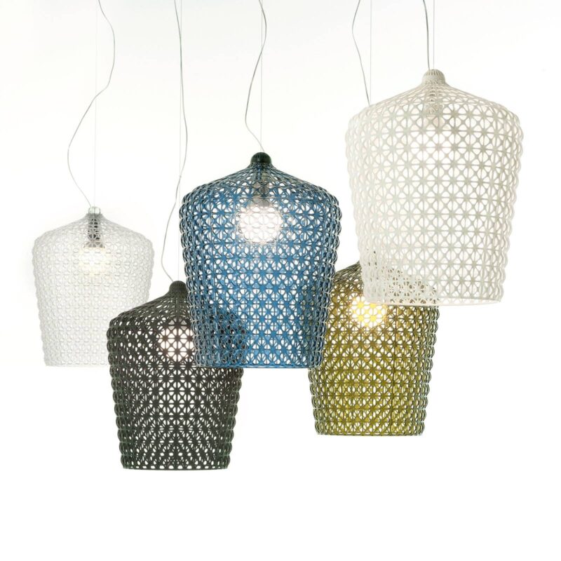 Dizajnová závesná lampa Kabuki s tienidlo na lampu v čipkovanom vzhľade tienidlo na lampu závesnej lampy Kabuki sa vyznačuje na jednej strane modernými materiálmi a výrobnými postupmi a na druhej strane špeciálnou štruktúrou, ktorá svojimi malými vynechaniami pripomína ušľachtilú čipku. Kabuki je vyrobené z termoplastického technopolyméru, ktorý sa spracováva vstrekovaním. Mnoho malých vynechaní v tienidlo na lampu vytvára po zapnutí žiarovky zaujímavú hru svetla. Taliansky architekt a dizajnér Ferruccio Laviani navrhol sériu osvetlenia Kabuki ako umeleckého riaditeľa pre spoločnosť Kartell . Kartell nábytku, svetiel a predmetov každodennej potreby vyrobených z plastu. Dizajnérske kúsky, ako napríklad detská stolička K 1340, lis na citrón KS1481 alebo lampa 4032 Tic Tac, boli v mene spoločnosti Kartell vyrobené za posledných pár desaťročí a už patria medzi klasiku svojho druhu.